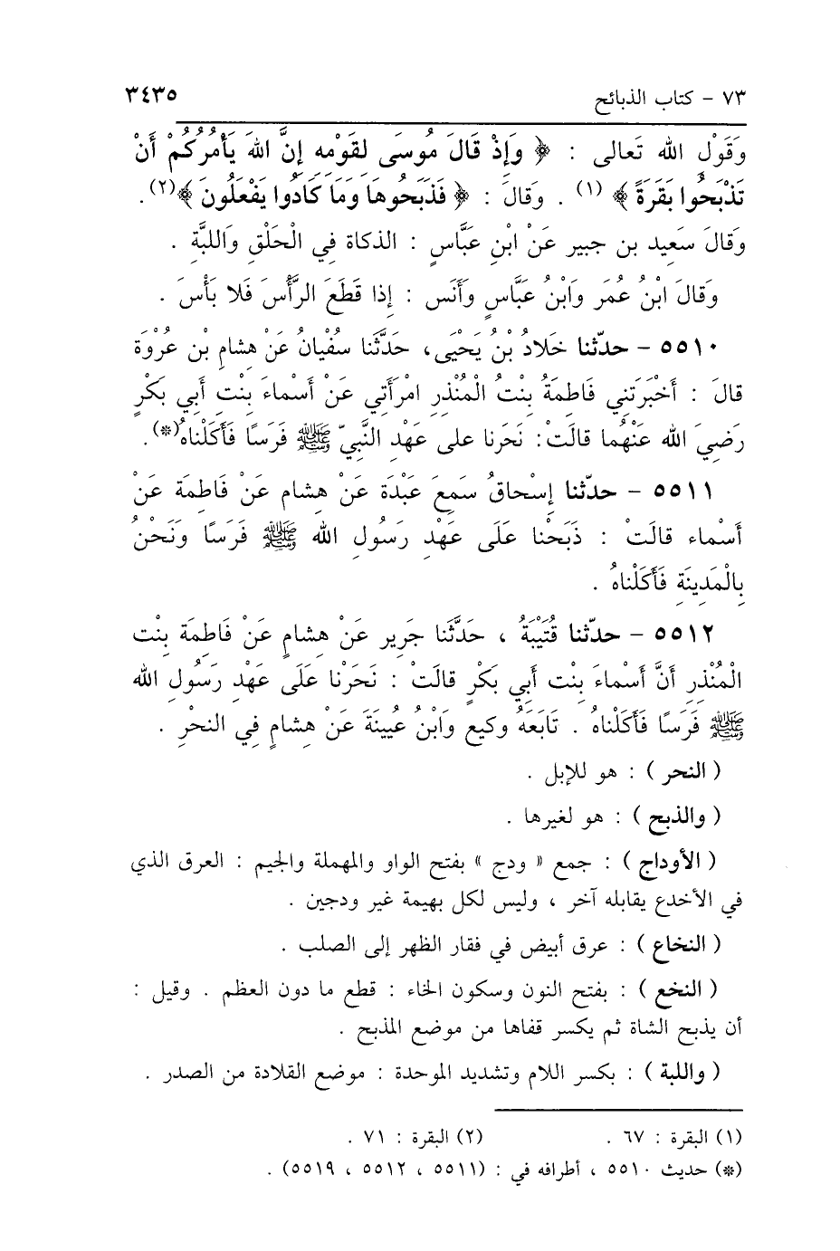 5512 - حَدَّثَنَا قُتَيْبَةُ، حَدَّثَنَا جَرِيرٌ، عَنْ هِشَامٍ، عَنْ فَاطِمَةَ بِنْتِ المُنْذِرِ، أَنَّ أَسْمَاءَ بِنْتَ أَبِي بَكْرٍ، قَالَتْ: «نَحَرْنَا عَلَى عَهْدِ رَسُولِ اللَّهِ صَلَّى اللهُ عَلَيْهِ وَسَلَّمَ فَرَسًا فَأَكَلْنَاهُ» تَابَعَهُ وَكِيعٌ، وَابْنُ عُيَيْنَةَ، عَنْ هِشَامٍ: فِي النَّحْرِ.