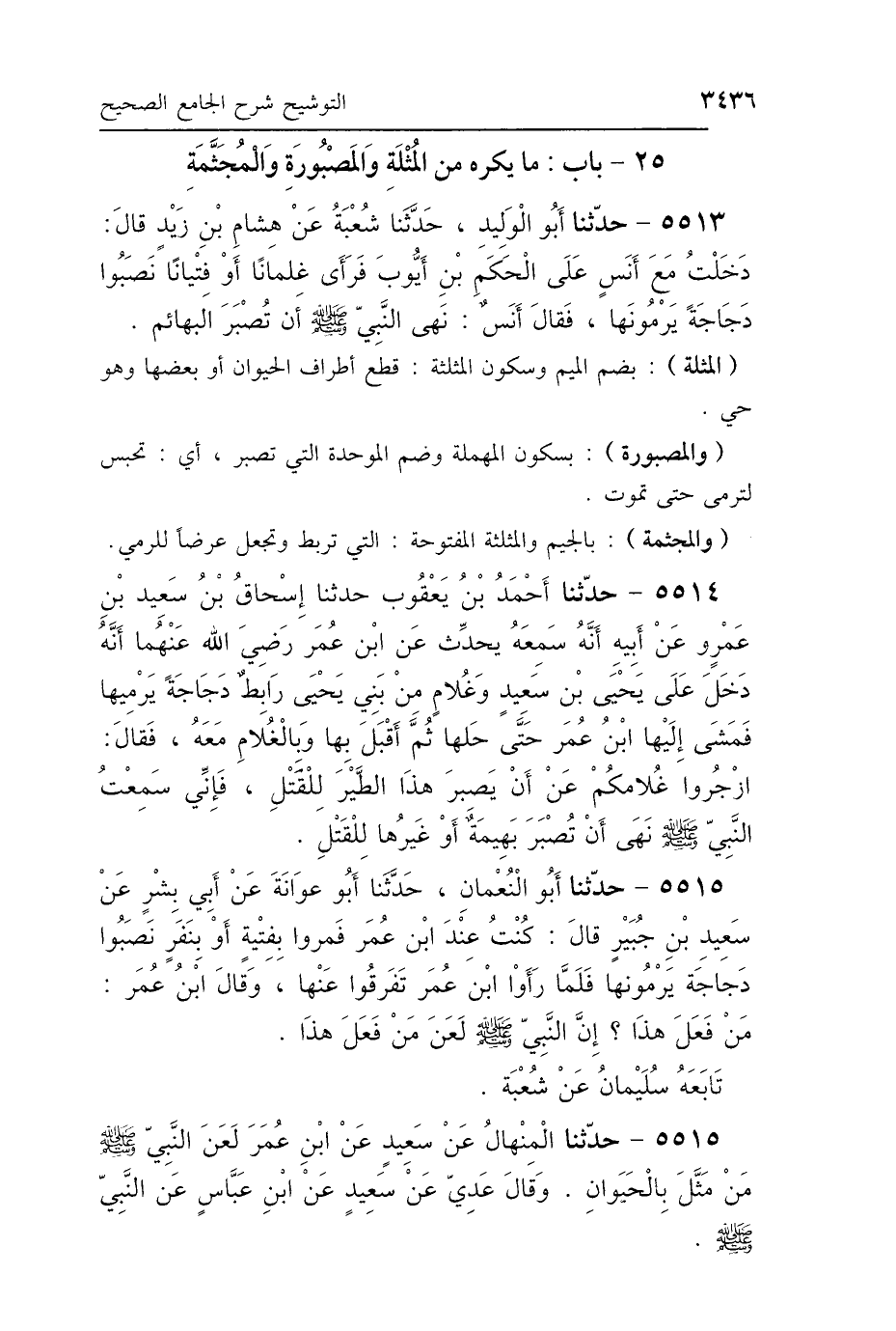 5515 - حَدَّثَنَا أَبُو النُّعْمَانِ، حَدَّثَنَا أَبُو عَوَانَةَ، عَنْ أَبِي بِشْرٍ، عَنْ سَعِيدِ بْنِ جُبَيْرٍ، قَالَ: كُنْتُ عِنْدَ ابْنِ عُمَرَ، فَمَرُّوا بِفِتْيَةٍ، أَوْ بِنَفَرٍ، نَصَبُوا دَجَاجَةً يَرْمُونَهَا، فَلَمَّا رَأَوْا ابْنَ عُمَرَ تَفَرَّقُوا عَنْهَا، وَقَالَ ابْنُ عُمَرَ: «مَنْ فَعَلَ هَذَا؟» إِنَّ النَّبِيَّ صَلَّى اللهُ عَلَيْهِ وَسَلَّمَ لَعَنَ مَنْ فَعَلَ هَذَا.