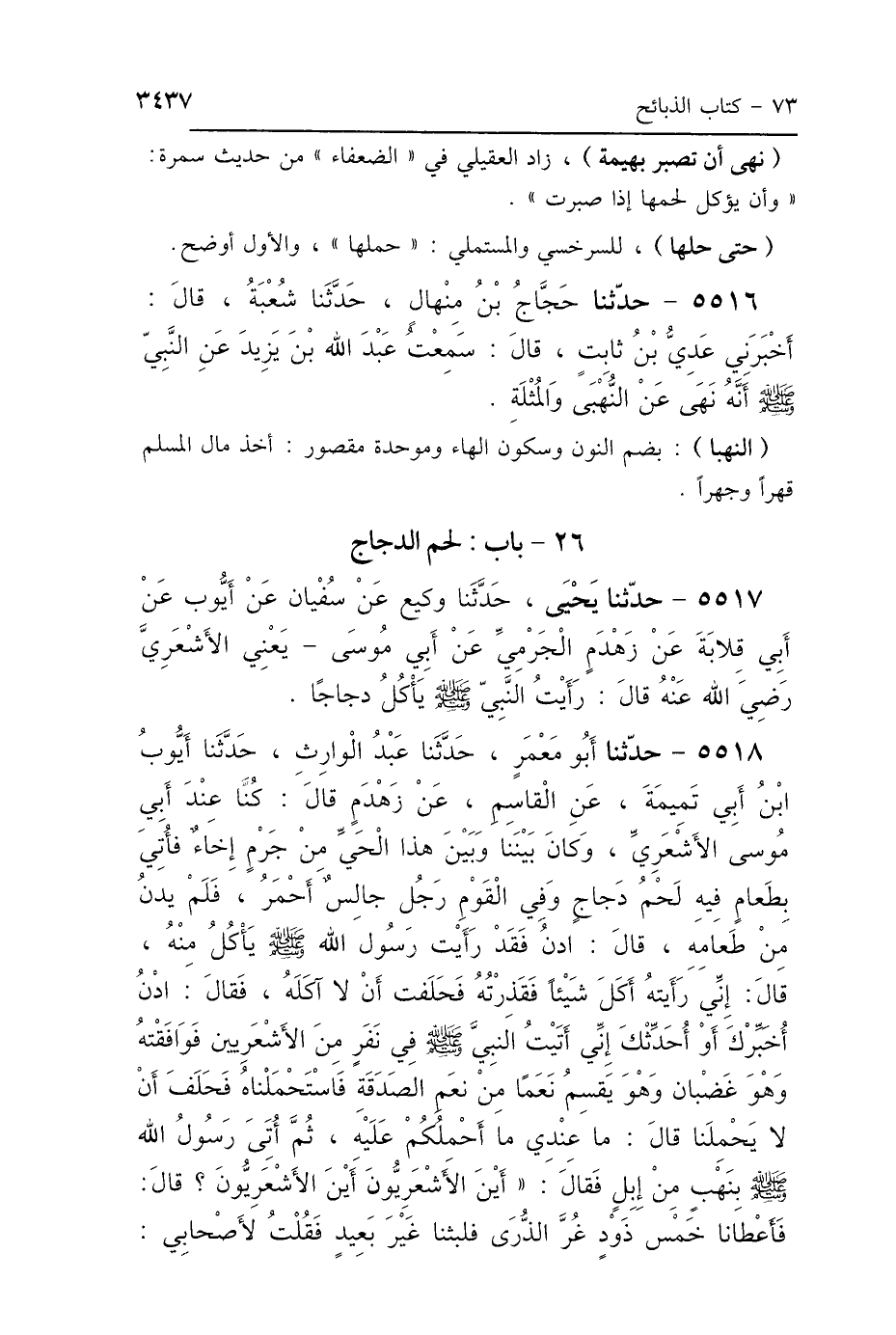 5517 - حَدَّثَنَا يَحْيَى، حَدَّثَنَا وَكِيعٌ، عَنْ سُفْيَانَ، عَنْ أَيُّوبَ، عَنْ أَبِي قِلاَبَةَ، عَنْ زَهْدَمٍ الجَرْمِيِّ، عَنْ أَبِي مُوسَى يَعْنِي الأَشْعَرِيَّ رَضِيَ اللَّهُ عَنْهُ، قَالَ: «رَأَيْتُ النَّبِيَّ صَلَّى اللهُ عَلَيْهِ وَسَلَّمَ يَأْكُلُ دَجَاجًا».