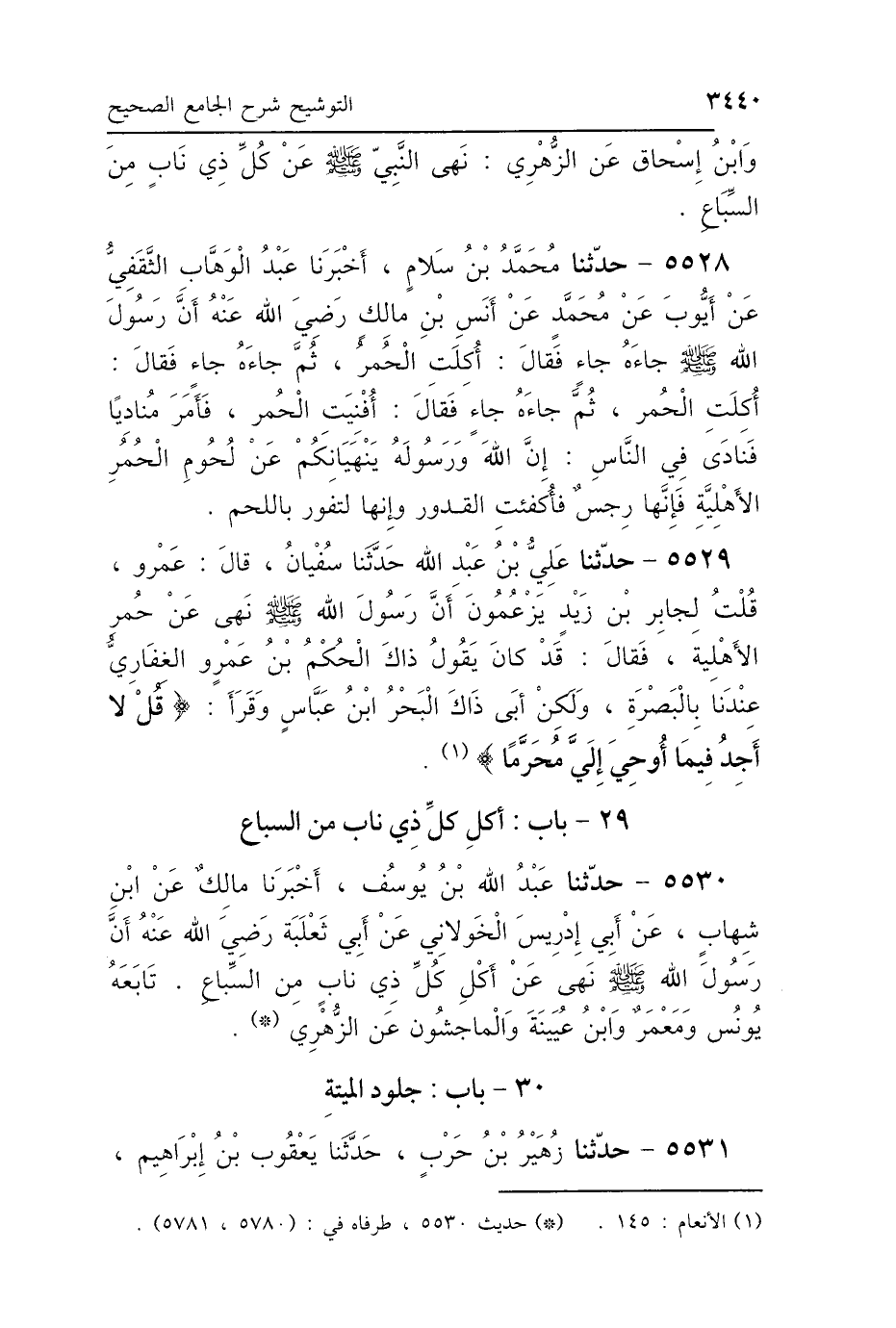 5530 - حَدَّثَنَا عَبْدُ اللَّهِ بْنُ يُوسُفَ، أَخْبَرَنَا مَالِكٌ، عَنِ ابْنِ شِهَابٍ، عَنْ أَبِي إِدْرِيسَ الخَوْلاَنِيِّ، عَنْ أَبِي ثَعْلَبَةَ رَضِيَ اللَّهُ عَنْهُ: «أَنَّ رَسُولَ اللَّهِ صَلَّى اللهُ عَلَيْهِ وَسَلَّمَ نَهَى عَنْ أَكْلِ كُلِّ ذِي نَابٍ مِنَ السِّبَاعِ» تَابَعَهُ يُونُسُ، وَمَعْمَرٌ، وَابْنُ عُيَيْنَةَ، وَالمَاجِشُونُ، عَنِ الزُّهْرِيِّ.