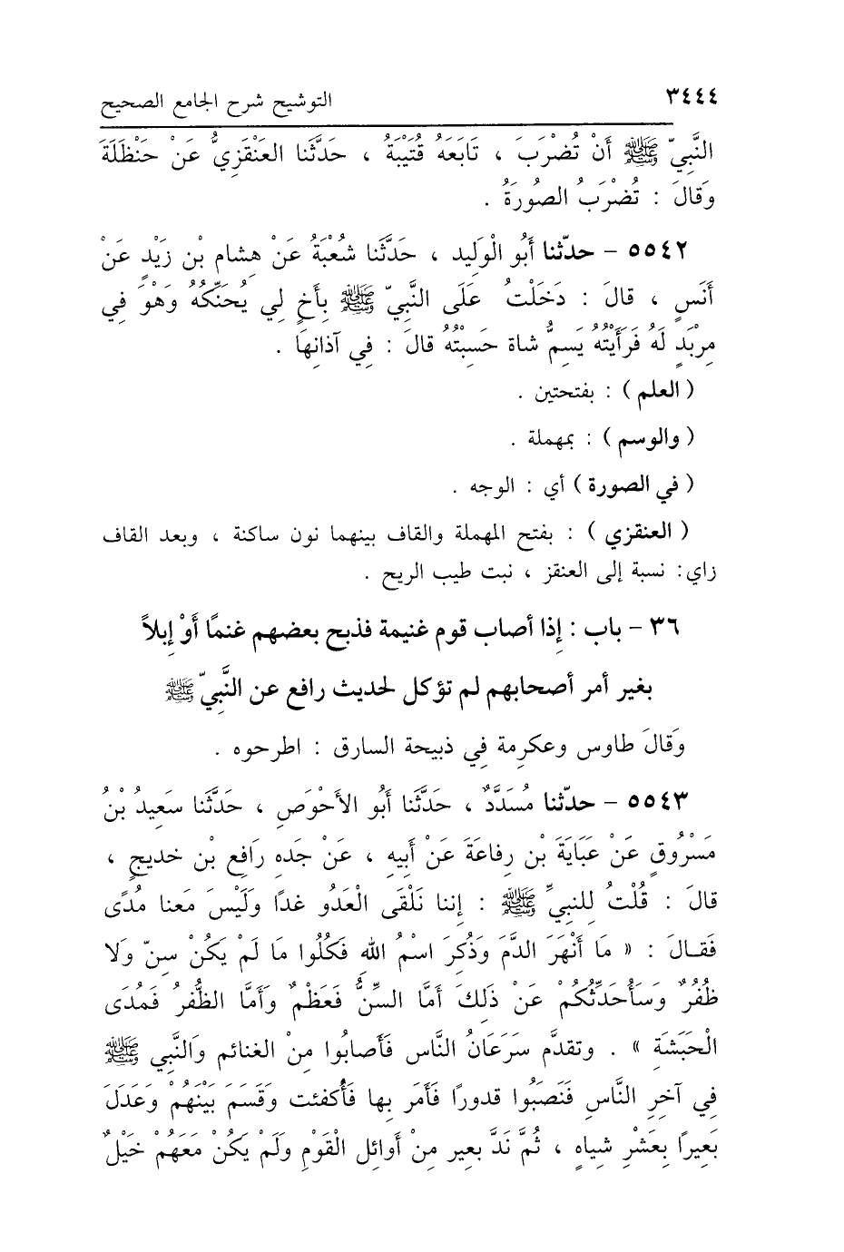 5543 - حَدَّثَنَا مُسَدَّدٌ، حَدَّثَنَا أَبُو الأَحْوَصِ، حَدَّثَنَا سَعِيدُ بْنُ مَسْرُوقٍ، عَنْ عَبَايَةَ بْنِ رِفَاعَةَ، عَنْ أَبِيهِ، عَنْ جَدِّهِ رَافِعِ بْنِ خَدِيجٍ، قَالَ: قُلْتُ لِلنَّبِيِّ صَلَّى اللهُ عَلَيْهِ وَسَلَّمَ: إِنَّنَا نَلْقَى العَدُوَّ غَدًا وَلَيْسَ مَعَنَا مُدًى، فَقَالَ: " مَا أَنْهَرَ الدَّمَ وَذُكِرَ اسْمُ اللَّهِ فَكُلُوهُ، مَا لَمْ يَكُنْ سِنٌّ وَلاَ ظُفُرٌ، وَسَأُحَدِّثُكُمْ عَنْ ذَلِكَ: أَمَّا السِّنُّ فَعَظْمٌ، وَأَمَّا الظُّفْرُ فَمُدَى الحَبَشَةِ " وَتَقَدَّمَ سَرَعَانُ النَّاسِ فَأَصَابُوا مِنَ الغَنَائِمِ، وَالنَّبِيُّ صَلَّى اللهُ عَلَيْهِ وَسَلَّمَ فِي آخِرِ النَّاسِ، فَنَصَبُوا قُدُورًا فَأَمَرَ بِهَا فَأُكْفِئَتْ، وَقَسَمَ بَيْنَهُمْ وَعَدَلَ بَعِيرًا بِعَشْرِ شِيَاهٍ، ثُمَّ نَدَّ بَعِيرٌ مِنْ أَوَائِلِ القَوْمِ، وَلَمْ يَكُنْ مَعَهُمْ خَيْلٌ،