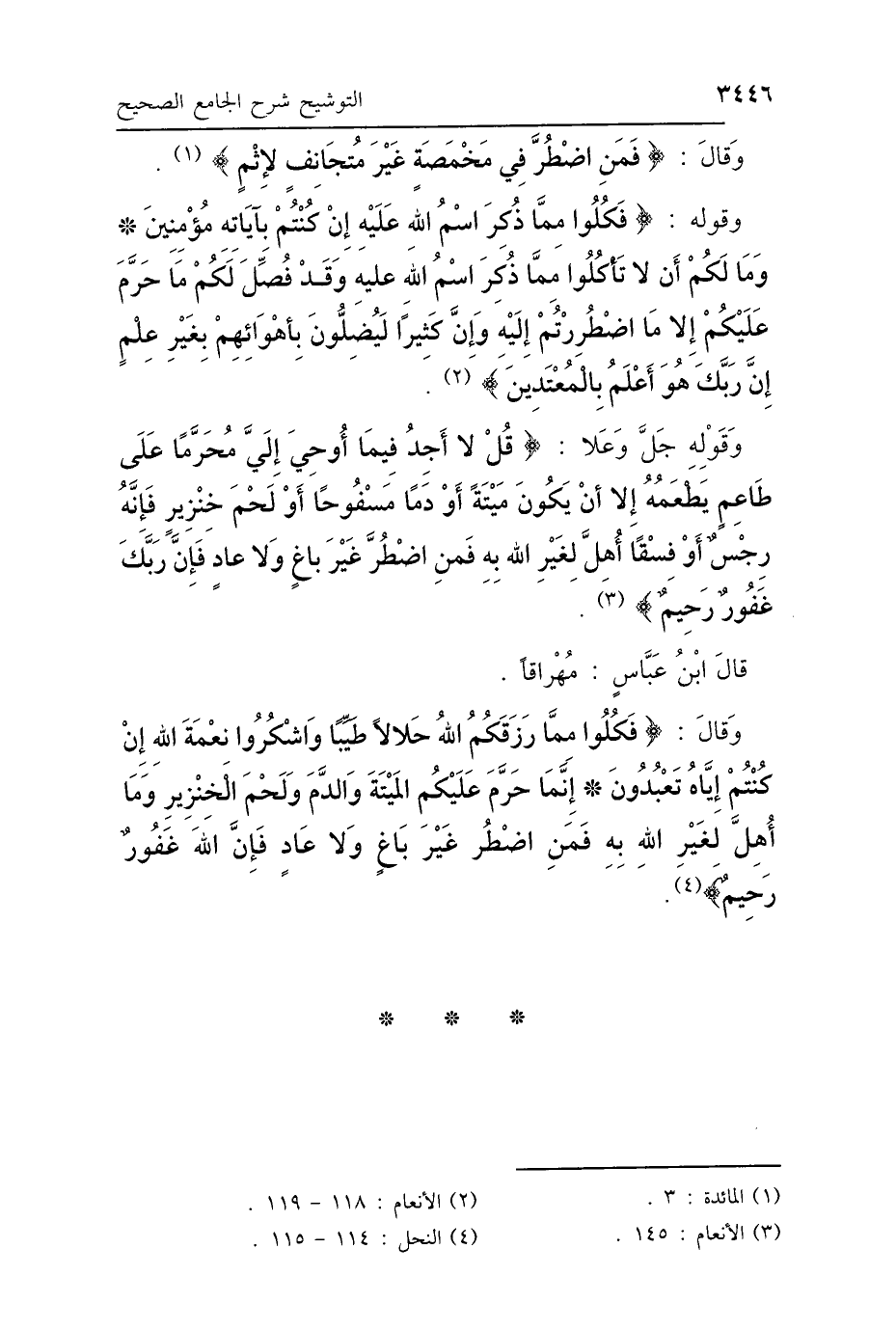 وَقَالَ: {فَمَنِ اضْطُرَّ فِي مَخْمَصَةٍ غَيْرَ مُتَجَانِفٍ لِإِثْمٍ} [المائدة: 3] وَقَوْلِهِ: (فَكُلُوا مِمَّا ذُكِرَ اسْمُ اللَّهِ عَلَيْهِ إِنْ كُنْتُمْ بِآيَاتِهِ مُؤْمِنِينَ. وَمَا لَكُمْ أَنْ لاَ تَأْكُلُوا مِمَّا ذُكِرَ اسْمُ اللَّهِ عَلَيْهِ وَقَدْ فُصِّلَ لَكُمْ مَا حُرِّمَ عَلَيْكُمْ إِلَّا مَا اضْطُرِرْتُمْ إِلَيْهِ وَإِنَّ كَثِيرًا لَيُضِلُّونَ بِأَهْوَائِهِمْ بِغَيْرِ عِلْمٍ إِنَّ رَبَّكَ هُوَ أَعْلَمُ بِالْمُعْتَدِينَ) وَقَوْلِهِ جَلَّ وَعَلاَ: {قُلْ لاَ أَجِدُ فِيمَا أُوحِيَ إِلَيَّ مُحَرَّمًا عَلَى طَاعِمٍ يَطْعَمُهُ إِلَّا أَنْ يَكُونَ مَيْتَةً أَوْ دَمًا مَسْفُوحًا} قَالَ ابْنُ عَبَّاسٍ: «مُهْرَاقًا» {أَوْ لَحْمَ خِنْزِيرٍ فَإِنَّهُ رِجْسٌ أَوْ فِسْقًا أُهِلَّ لِغَيْرِ اللَّهِ بِهِ، فَمَنِ اضْطُرَّ غَيْرَ بَاغٍ وَلاَ عَادٍ فَإِنَّ رَبَّكَ غَفُورٌ رَحِيمٌ} [الأنعام: 145] وَقَالَ: {فَكُلُوا مِمَّا رَزَقَكُمُ اللَّهُ حَلاَلًا طَيِّبًا، وَاشْكُرُوا نِعْمَةَ اللَّهِ إِنْ كُنْتُمْ إِيَّاهُ تَعْبُدُونَ، إِنَّمَا حَرَّمَ عَلَيْكُمُ المَيْتَةَ وَالدَّمَ وَلَحْمَ الخِنْزِيرِ وَمَا أُهِلَّ لغَيْرِ اللَّهِ بِهِ، فَمَنِ اضْطُرَّ غَيْرَ بَاغٍ وَلاَ عَادٍ فَإِنَّ اللَّهَ غَفُورٌ رَحِيمٌ}.