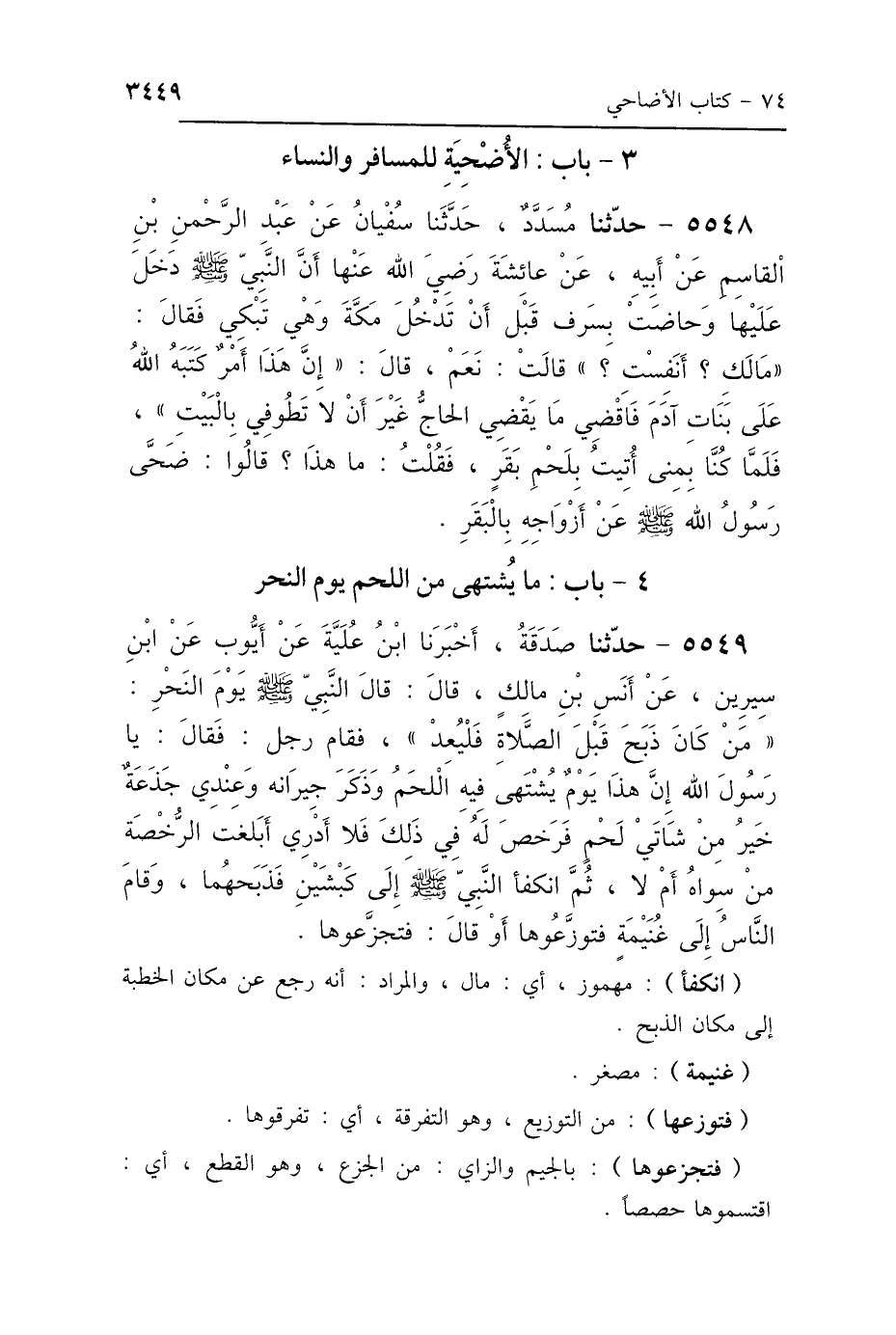 5549 - حَدَّثَنَا صَدَقَةُ، أَخْبَرَنَا ابْنُ عُلَيَّةَ، عَنْ أَيُّوبَ، عَنِ ابْنِ سِيرِينَ، عَنْ أَنَسِ بْنِ مَالِكٍ، قَالَ: قَالَ النَّبِيُّ صَلَّى اللهُ عَلَيْهِ وَسَلَّمَ يَوْمَ النَّحْرِ: «مَنْ كَانَ ذَبَحَ قَبْلَ الصَّلاَةِ فَلْيُعِدْ» فَقَامَ رَجُلٌ فَقَالَ: يَا رَسُولَ اللَّهِ، إِنَّ هَذَا يَوْمٌ يُشْتَهَى فِيهِ اللَّحْمُ - وَذَكَرَ جِيرَانَهُ - وَعِنْدِي جَذَعَةٌ خَيْرٌ مِنْ شَاتَيْ لَحْمٍ؟ فَرَخَّصَ لَهُ فِي ذَلِكَ، فَلاَ أَدْرِي بَلَغَتِ الرُّخْصَةُ مَنْ سِوَاهُ أَمْ لاَ، ثُمَّ انْكَفَأَ النَّبِيُّ صَلَّى اللهُ عَلَيْهِ وَسَلَّمَ إِلَى كَبْشَيْنِ فَذَبَحَهُمَا، وَقَامَ النَّاسُ إِلَى غُنَيْمَةٍ فَتَوَزَّعُوهَا، أَوْ قَالَ: فَتَجَزَّعُوهَا.