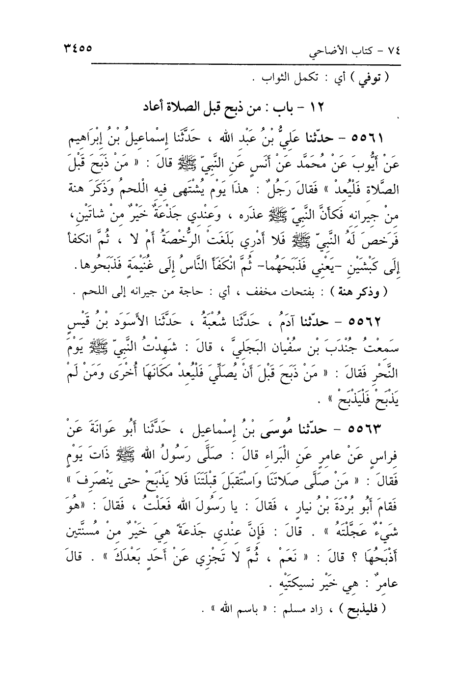 5561 - حَدَّثَنَا عَلِيُّ بْنُ عَبْدِ اللَّهِ، حَدَّثَنَا إِسْمَاعِيلُ بْنُ إِبْرَاهِيمَ، عَنْ أَيُّوبَ، عَنْ مُحَمَّدٍ، عَنْ أَنَسٍ، عَنِ النَّبِيِّ صَلَّى اللهُ عَلَيْهِ وَسَلَّمَ قَالَ: «مَنْ ذَبَحَ قَبْلَ الصَّلاَةِ فَلْيُعِدْ» فَقَالَ رَجُلٌ: هَذَا يَوْمٌ يُشْتَهَى فِيهِ اللَّحْمُ، - وَذَكَرَ هَنَةً مِنْ جِيرَانِهِ - فَكَأَنَّ النَّبِيَّ صَلَّى اللهُ عَلَيْهِ وَسَلَّمَ عَذَرَهُ، وَعِنْدِي جَذَعَةٌ خَيْرٌ مِنْ شَاتَيْنِ؟ فَرَخَّصَ لَهُ النَّبِيُّ صَلَّى اللهُ عَلَيْهِ وَسَلَّمَ، فَلاَ أَدْرِي بَلَغَتِ الرُّخْصَةُ أَمْ لاَ، ثُمَّ انْكَفَأَ إِلَى كَبْشَيْنِ، يَعْنِي فَذَبَحَهُمَا، ثُمَّ انْكَفَأَ النَّاسُ إِلَى غُنَيْمَةٍ فَذَبَحُوهَا.