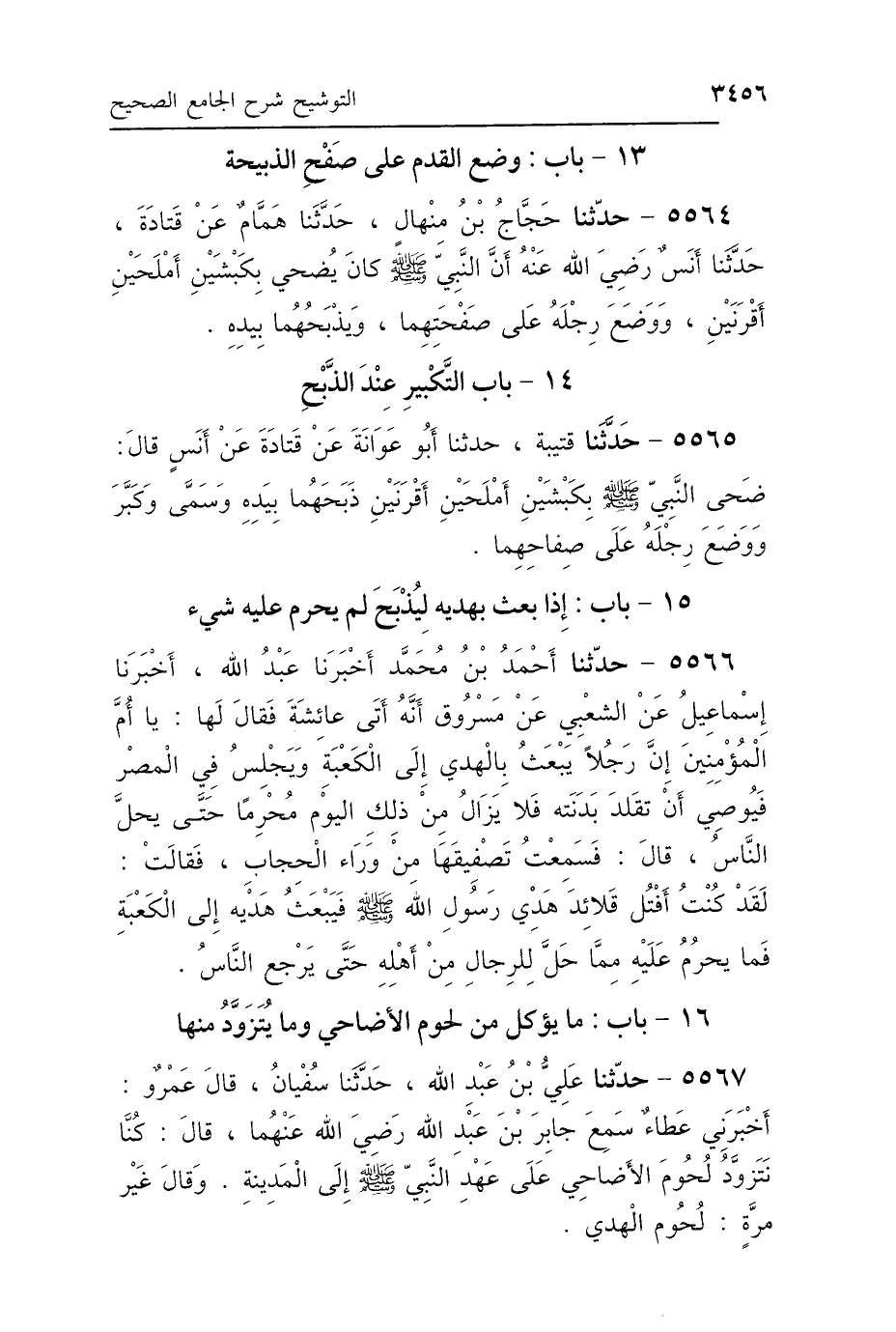 5565 - حَدَّثَنَا قُتَيْبَةُ، حَدَّثَنَا أَبُو عَوَانَةَ، عَنْ قَتَادَةَ، عَنْ أَنَسٍ، قَالَ: «ضَحَّى النَّبِيُّ صَلَّى اللهُ عَلَيْهِ وَسَلَّمَ بِكَبْشَيْنِ أَمْلَحَيْنِ أَقْرَنَيْنِ، ذَبَحَهُمَا بِيَدِهِ، وَسَمَّى وَكَبَّرَ، وَوَضَعَ رِجْلَهُ عَلَى صِفَاحِهِمَا».