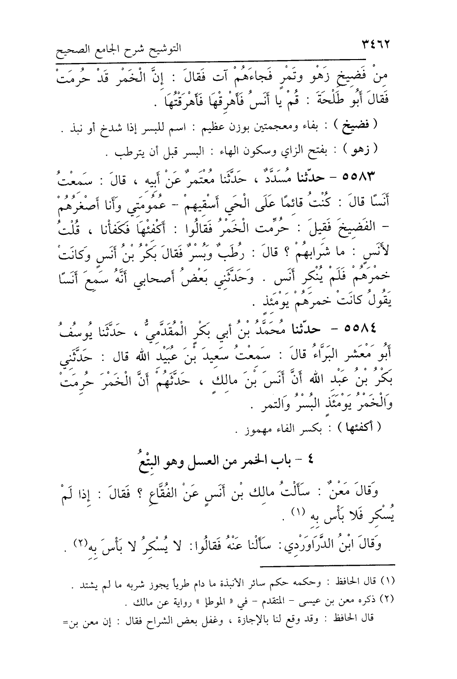 5583 - حَدَّثَنَا مُسَدَّدٌ، حَدَّثَنَا مُعْتَمِرٌ، عَنْ أَبِيهِ، قَالَ: سَمِعْتُ أَنَسًا، قَالَ: " كُنْتُ قَائِمًا عَلَى الحَيِّ أَسْقِيهِمْ، عُمُومَتِي وَأَنَا أَصْغَرُهُمْ، الفَضِيخَ، فَقِيلَ: حُرِّمَتِ الخَمْرُ، فَقَالُوا: أَكْفِئْهَا، فَكَفَأْتُهَا " قُلْتُ لِأَنَسٍ: مَا شَرَابُهُمْ؟ قَالَ: «رُطَبٌ وَبُسْرٌ» فَقَالَ أَبُو بَكْرِ بْنُ أَنَسٍ: وَكَانَتْ خَمْرَهُمْ، فَلَمْ يُنْكِرْ أَنَسٌ وَحَدَّثَنِي بَعْضُ أَصْحَابِي: أَنَّهُ سَمِعَ أَنَسَ بْنَ مَالِكٍ يَقُولُ: «كَانَتْ خَمْرَهُمْ يَوْمَئِذٍ».