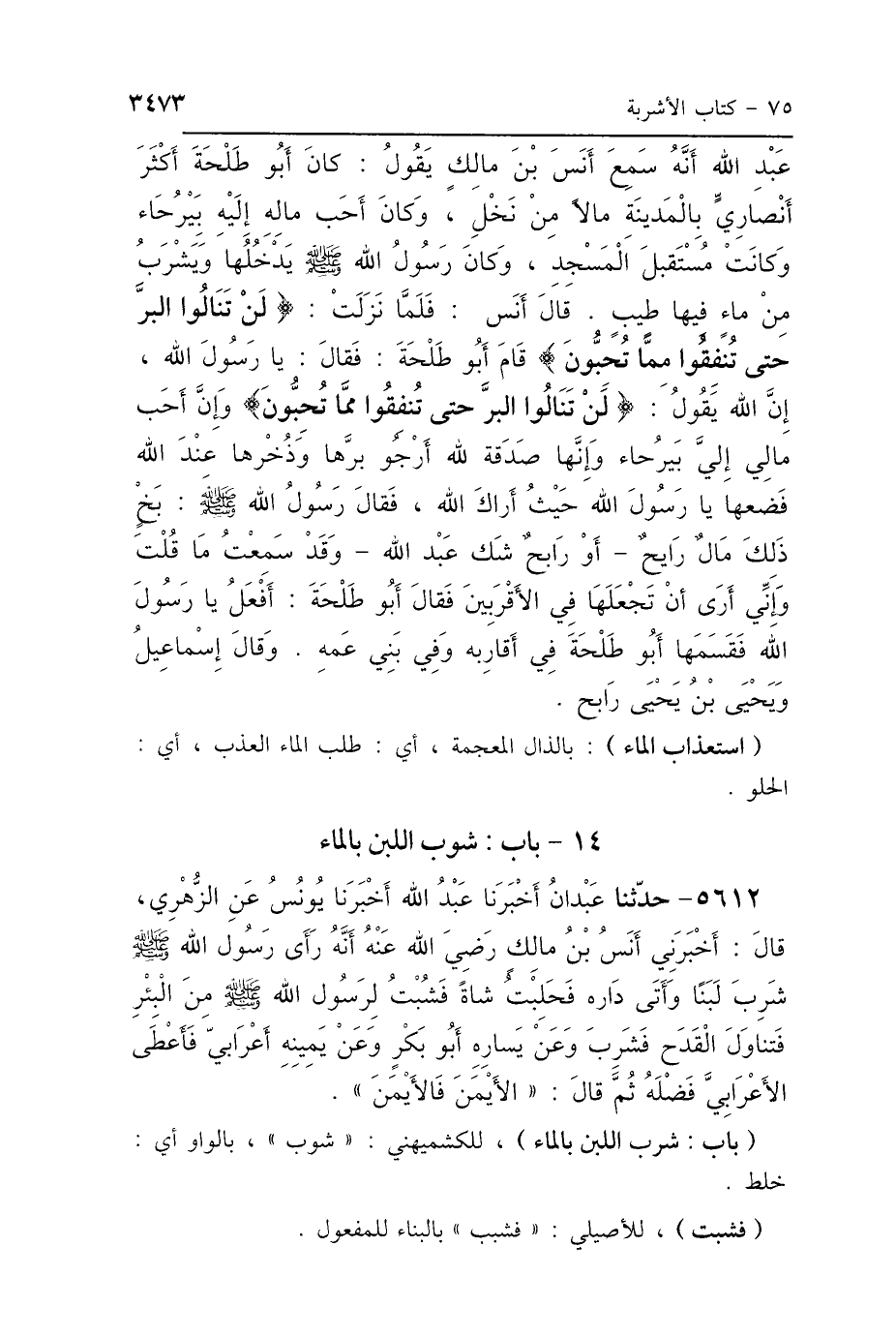 عَبْدِ اللَّهِ، أَنَّهُ سَمِعَ أَنَسَ بْنَ مَالِكٍ، يَقُولُ: كَانَ أَبُو طَلْحَةَ أَكْثَرَ أَنْصَارِيٍّ بِالْمَدِينَةِ مَالًا مِنْ نَخْلٍ، وَكَانَ أَحَبُّ مَالِهِ إِلَيْهِ بَيْرُحَاءَ، وَكَانَتْ مُسْتَقْبِلَ المَسْجِدِ، وَكَانَ رَسُولُ اللَّهِ صَلَّى اللهُ عَلَيْهِ وَسَلَّمَ يَدْخُلُهَا وَيَشْرَبُ مِنْ مَاءٍ فِيهَا طَيِّبٍ، قَالَ أَنَسٌ: فَلَمَّا نَزَلَتْ: {لَنْ تَنَالُوا البِرَّ حَتَّى تُنْفِقُوا مِمَّا تُحِبُّونَ} [آل عمران: 92] قَامَ أَبُو طَلْحَةَ فَقَالَ: يَا رَسُولَ اللَّهِ، إِنَّ اللَّهَ يَقُولُ: {لَنْ تَنَالُوا البِرَّ حَتَّى تُنْفِقُوا مِمَّا تُحِبُّونَ} [آل عمران: 92] وَإِنَّ أَحَبَّ مَالِي إِلَيَّ بَيْرُحَاءَ، وَإِنَّهَا صَدَقَةٌ لِلَّهِ أَرْجُو بِرَّهَا وَذُخْرَهَا عِنْدَ اللَّهِ، فَضَعْهَا يَا رَسُولَ اللَّهِ حَيْثُ أَرَاكَ اللَّهُ، فَقَالَ رَسُولُ اللَّهِ صَلَّى اللهُ عَلَيْهِ وَسَلَّمَ: «بَخٍ، ذَلِكَ مَالٌ رَابِحٌ، أَوْ رَايِحٌ - شَكَّ عَبْدُ اللَّهِ - وَقَدْ سَمِعْتُ مَا قُلْتَ، وَإِنِّي أَرَى أَنْ تَجْعَلَهَا فِي الأَقْرَبِينَ» فَقَالَ أَبُو طَلْحَةَ: أَفْعَلُ يَا رَسُولَ اللَّهِ، فَقَسَمَهَا أَبُو طَلْحَةَ فِي أَقَارِبِهِ وَفِي بَنِي عَمِّهِ وَقَالَ إِسْمَاعِيلُ، وَيَحْيَى بْنُ يَحْيَى: «رَايِحٌ».