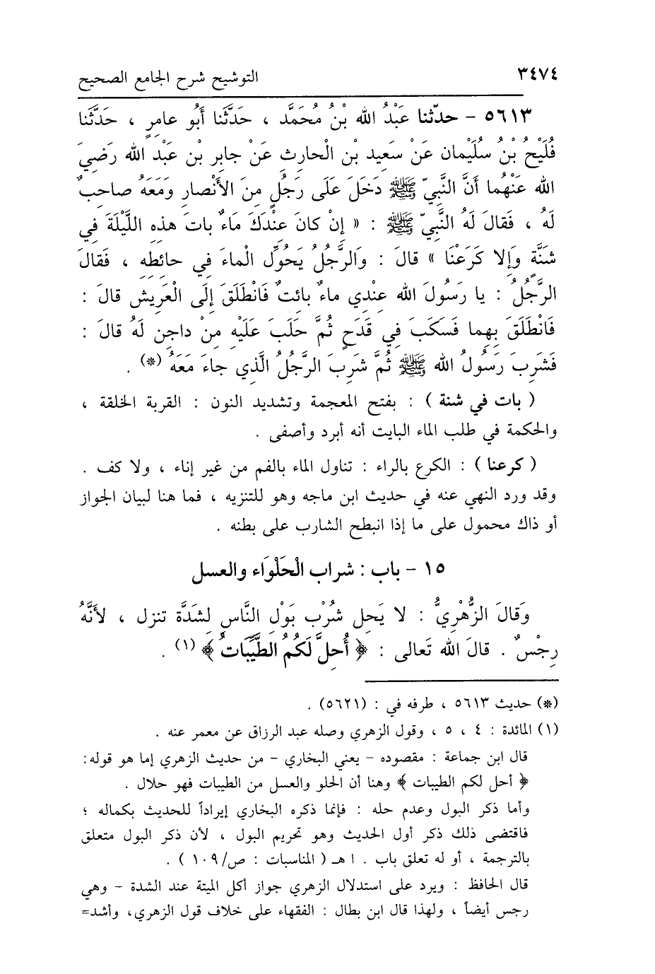 5613 - حَدَّثَنَا عَبْدُ اللَّهِ بْنُ مُحَمَّدٍ، حَدَّثَنَا أَبُو عَامِرٍ، حَدَّثَنَا فُلَيْحُ بْنُ سُلَيْمَانَ، عَنْ سَعِيدِ بْنِ الحَارِثِ، عَنْ جَابِرِ بْنِ عَبْدِ اللَّهِ رَضِيَ اللَّهُ عَنْهُمَا: أَنَّ النَّبِيَّ صَلَّى اللهُ عَلَيْهِ وَسَلَّمَ دَخَلَ عَلَى رَجُلٍ مِنَ الأَنْصَارِ وَمَعَهُ صَاحِبٌ لَهُ، فَقَالَ لَهُ النَّبِيُّ صَلَّى اللهُ عَلَيْهِ وَسَلَّمَ: «إِنْ كَانَ عِنْدَكَ مَاءٌ بَاتَ هَذِهِ اللَّيْلَةَ فِي شَنَّةٍ وَإِلَّا كَرَعْنَا» قَالَ: وَالرَّجُلُ يُحَوِّلُ المَاءَ فِي حَائِطِهِ، قَالَ: فَقَالَ الرَّجُلُ: يَا رَسُولَ اللَّهِ، عِنْدِي مَاءٌ بَائِتٌ، فَانْطَلِقْ إِلَى العَرِيشِ، قَالَ: فَانْطَلَقَ بِهِمَا، فَسَكَبَ فِي قَدَحٍ، ثُمَّ حَلَبَ عَلَيْهِ مِنْ دَاجِنٍ لَهُ، قَالَ: فَشَرِبَ رَسُولُ اللَّهِ صَلَّى اللهُ عَلَيْهِ وَسَلَّمَ، ثُمَّ شَرِبَ الرَّجُلُ الَّذِي جَاءَ مَعَهُ.
