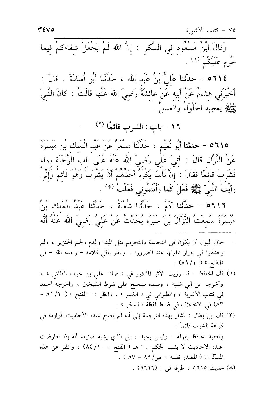 5615 - حَدَّثَنَا أَبُو نُعَيْمٍ، حَدَّثَنَا مِسْعَرٌ، عَنْ عَبْدِ المَلِكِ بْنِ مَيْسَرَةَ، عَنِ النَّزَّالِ، قَالَ: أَتَى عَلِيٌّ رَضِيَ اللَّهُ عَنْهُ عَلَى بَابِ الرَّحَبَةِ «فَشَرِبَ قَائِمًا» فَقَالَ: إِنَّ نَاسًا يَكْرَهُ أَحَدُهُمْ أَنْ يَشْرَبَ وَهُوَ قَائِمٌ، وَإِنِّي «رَأَيْتُ النَّبِيَّ صَلَّى اللهُ عَلَيْهِ وَسَلَّمَ فَعَلَ كَمَا رَأَيْتُمُونِي فَعَلْتُ».