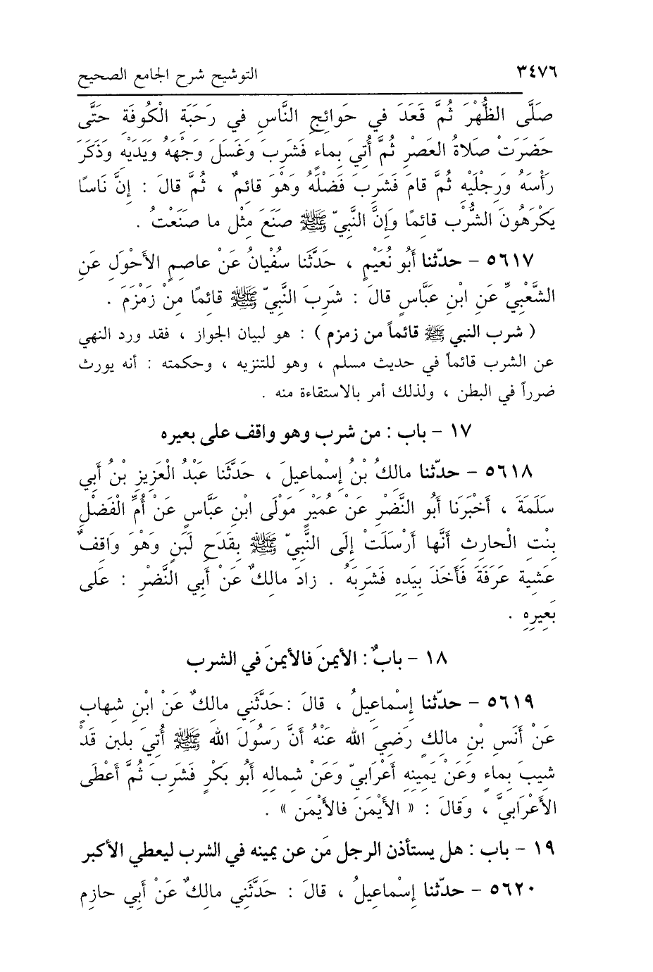 5617 - حَدَّثَنَا أَبُو نُعَيْمٍ، حَدَّثَنَا سُفْيَانُ، عَنْ عَاصِمٍ الأَحْوَلِ، عَنِ الشَّعْبِيِّ، عَنِ ابْنِ عَبَّاسٍ، قَالَ: «شَرِبَ النَّبِيُّ صَلَّى اللهُ عَلَيْهِ وَسَلَّمَ قَائِمًا مِنْ زَمْزَمَ».