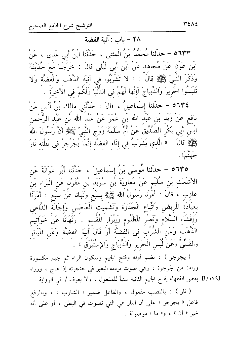 5634 - حَدَّثَنَا إِسْمَاعِيلُ، قَالَ: حَدَّثَنِي مَالِكُ بْنُ أَنَسٍ، عَنْ نَافِعٍ، عَنْ زَيْدِ بْنِ عَبْدِ اللَّهِ بْنِ عُمَرَ، عَنْ عَبْدِ اللَّهِ بْنِ عَبْدِ الرَّحْمَنِ بْنِ أَبِي بَكْرٍ الصِّدِّيقِ، عَنْ أُمِّ سَلَمَةَ، زَوْجِ النَّبِيِّ صَلَّى اللهُ عَلَيْهِ وَسَلَّمَ: أَنَّ رَسُولَ اللَّهِ صَلَّى اللهُ عَلَيْهِ وَسَلَّمَ قَالَ: «الَّذِي يَشْرَبُ فِي إِنَاءِ الفِضَّةِ إِنَّمَا يُجَرْجِرُ فِي بَطْنِهِ نَارَ جَهَنَّمَ».
