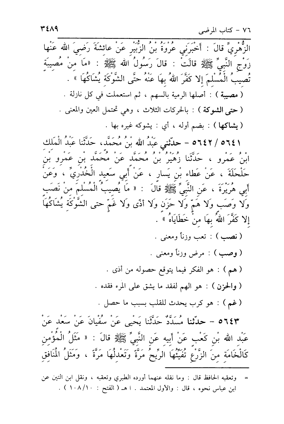 الزُّهْرِيِّ، قَالَ: أَخْبَرَنِي عُرْوَةُ بْنُ الزُّبَيْرِ، أَنَّ عَائِشَةَ رَضِيَ اللَّهُ عَنْهَا، زَوْجَ النَّبِيِّ صَلَّى اللهُ عَلَيْهِ وَسَلَّمَ، قَالَتْ: قَالَ رَسُولُ اللَّهِ صَلَّى اللهُ عَلَيْهِ وَسَلَّمَ: «مَا مِنْ مُصِيبَةٍ تُصِيبُ المُسْلِمَ إِلَّا كَفَّرَ اللَّهُ بِهَا عَنْهُ، حَتَّى الشَّوْكَةِ يُشَاكُهَا».