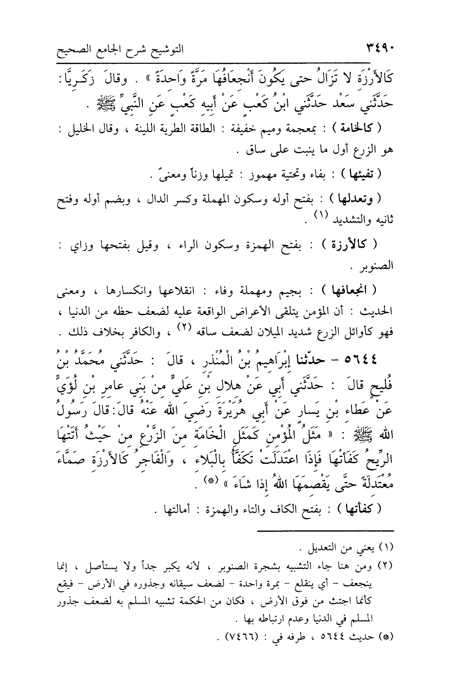 (انجعافها): بجيم ومهملة وفاء: انقلاعها وانكسارها، ومعنى الحديث: أن المؤمن يتلقى الأعراض الواقعة عليه لضعف حظه من الدنيا، فهو كأوائل الزرع شديد الميلان لضعف ساقه، والكافر بخلاف ذلك.