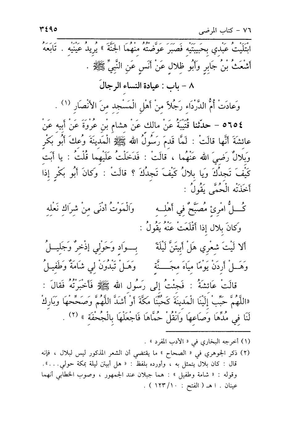 5654 - حَدَّثَنَا قُتَيْبَةُ، عَنْ مَالِكٍ، عَنْ هِشَامِ بْنِ عُرْوَةَ، عَنْ أَبِيهِ، عَنْ عَائِشَةَ، أَنَّهَا قَالَتْ: لَمَّا قَدِمَ رَسُولُ اللَّهِ صَلَّى اللهُ عَلَيْهِ وَسَلَّمَ المَدِينَةَ، وُعِكَ أَبُو بَكْرٍ وَبِلاَلٌ رَضِيَ اللَّهُ عَنْهُمَا، قَالَتْ: فَدَخَلْتُ عَلَيْهِمَا، قُلْتُ: يَا أَبَتِ كَيْفَ تَجِدُكَ؟ وَيَا بِلاَلُ كَيْفَ تَجِدُكَ؟ قَالَتْ: وَكَانَ أَبُو بَكْرٍ إِذَا أَخَذَتْهُ الحُمَّى، يَقُولُ: