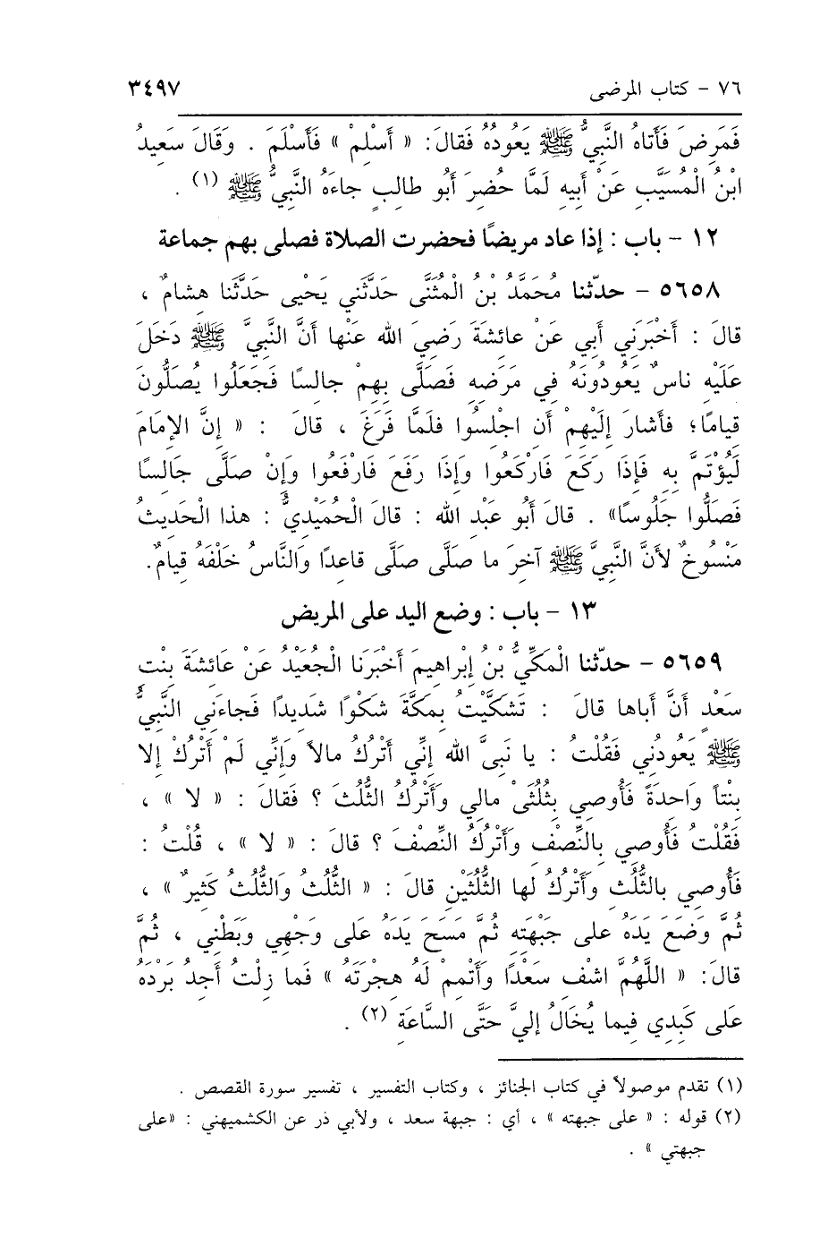 5658 - حَدَّثَنَا مُحَمَّدُ بْنُ المُثَنَّى، حَدَّثَنَا يَحْيَى، حَدَّثَنَا هِشَامٌ، قَالَ: أَخْبَرَنِي أَبِي، عَنْ عَائِشَةَ رَضِيَ اللَّهُ عَنْهَا: أَنَّ النَّبِيَّ صَلَّى اللهُ عَلَيْهِ وَسَلَّمَ دَخَلَ عَلَيْهِ نَاسٌ يَعُودُونَهُ فِي مَرَضِهِ، فَصَلَّى بِهِمْ جَالِسًا، فَجَعَلُوا يُصَلُّونَ قِيَامًا، فَأَشَارَ إِلَيْهِمْ: «اجْلِسُوا» فَلَمَّا فَرَغَ قَالَ: «إِنَّ الإِمَامَ لَيُؤْتَمُّ بِهِ، فَإِذَا رَكَعَ فَارْكَعُوا، وَإِذَا رَفَعَ فَارْفَعُوا، وَإِنْ صَلَّى جَالِسًا فَصَلُّوا جُلُوسًا» قَالَ أَبُو عَبْدِ اللَّهِ: قَالَ الحُمَيْدِيُّ: «هَذَا الحَدِيثُ مَنْسُوخٌ، لِأَنَّ النَّبِيَّ صَلَّى اللهُ عَلَيْهِ وَسَلَّمَ آخِرَ مَا صَلَّى صَلَّى قَاعِدًا وَالنَّاسُ خَلْفَهُ قِيَامٌ».