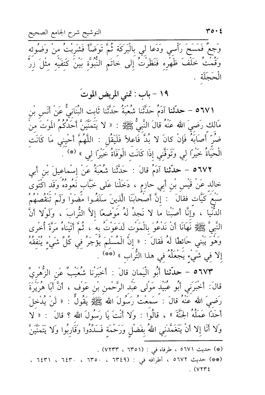 5672 - حَدَّثَنَا آدَمُ، حَدَّثَنَا شُعْبَةُ، عَنْ إِسْمَاعِيلَ بْنِ أَبِي خَالِدٍ، عَنْ قَيْسِ بْنِ أَبِي حَازِمٍ، قَالَ: دَخَلْنَا عَلَى خَبَّابٍ، نَعُودُهُ، وَقَدْ اكْتَوَى سَبْعَ كَيَّاتٍ، فَقَالَ: «إِنَّ أَصْحَابَنَا الَّذِينَ سَلَفُوا مَضَوْا وَلَمْ تَنْقُصْهُمُ الدُّنْيَا، وَإِنَّا أَصَبْنَا مَا لاَ نَجِدُ لَهُ مَوْضِعًا إِلَّا التُّرَابَ، وَلَوْلاَ أَنَّ النَّبِيَّ صَلَّى اللهُ عَلَيْهِ وَسَلَّمَ نَهَانَا أَنْ نَدْعُوَ بِالْمَوْتِ لَدَعَوْتُ بِهِ» ثُمَّ أَتَيْنَاهُ مَرَّةً أُخْرَى، وَهُوَ يَبْنِي حَائِطًا لَهُ، فَقَالَ: «إِنَّ المُسْلِمَ لَيُؤْجَرُ فِي كُلِّ شَيْءٍ يُنْفِقُهُ، إِلَّا فِي شَيْءٍ يَجْعَلُهُ فِي هَذَا التُّرَابِ».