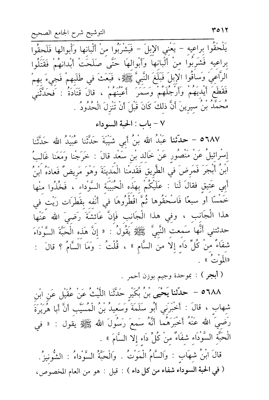 5688 - حَدَّثَنَا يَحْيَى بْنُ بُكَيْرٍ، حَدَّثَنَا اللَّيْثُ، عَنْ عُقَيْلٍ، عَنِ ابْنِ شِهَابٍ، قَالَ: أَخْبَرَنِي أَبُو سَلَمَةَ، وَسَعِيدُ بْنُ المُسَيِّبِ، أَنَّ أَبَا هُرَيْرَةَ، أَخْبَرَهُمَا: أَنَّهُ سَمِعَ رَسُولَ اللَّهِ صَلَّى اللهُ عَلَيْهِ وَسَلَّمَ يَقُولُ: «فِي الحَبَّةِ السَّوْدَاءِ شِفَاءٌ مِنْ كُلِّ دَاءٍ، إِلَّا السَّامَ» قَالَ ابْنُ شِهَابٍ: وَالسَّامُ المَوْتُ، وَالحَبَّةُ السَّوْدَاءُ: الشُّونِيزُ.