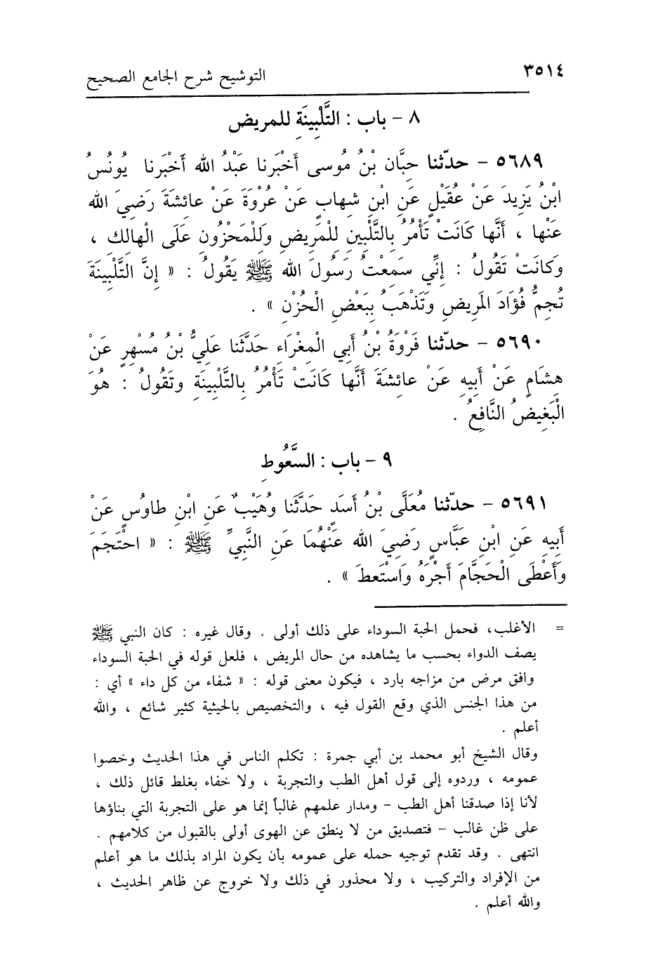 5689 - حَدَّثَنَا حِبَّانُ بْنُ مُوسَى، أَخْبَرَنَا عَبْدُ اللَّهِ، أَخْبَرَنَا يُونُسُ بْنُ يَزِيدَ، عَنْ عُقَيْلٍ، عَنِ ابْنِ شِهَابٍ، عَنْ عُرْوَةَ، عَنْ عَائِشَةَ رَضِيَ اللَّهُ عَنْهَا: أَنَّهَا كَانَتْ تَأْمُرُ بِالتَّلْبِينِ لِلْمَرِيضِ وَلِلْمَحْزُونِ عَلَى الهَالِكِ، وَكَانَتْ تَقُولُ: إِنِّي سَمِعْتُ رَسُولَ اللَّهِ صَلَّى اللهُ عَلَيْهِ وَسَلَّمَ يَقُولُ: «إِنَّ التَّلْبِينَةَ تُجِمُّ فُؤَادَ المَرِيضِ، وَتَذْهَبُ بِبَعْضِ الحُزْنِ».