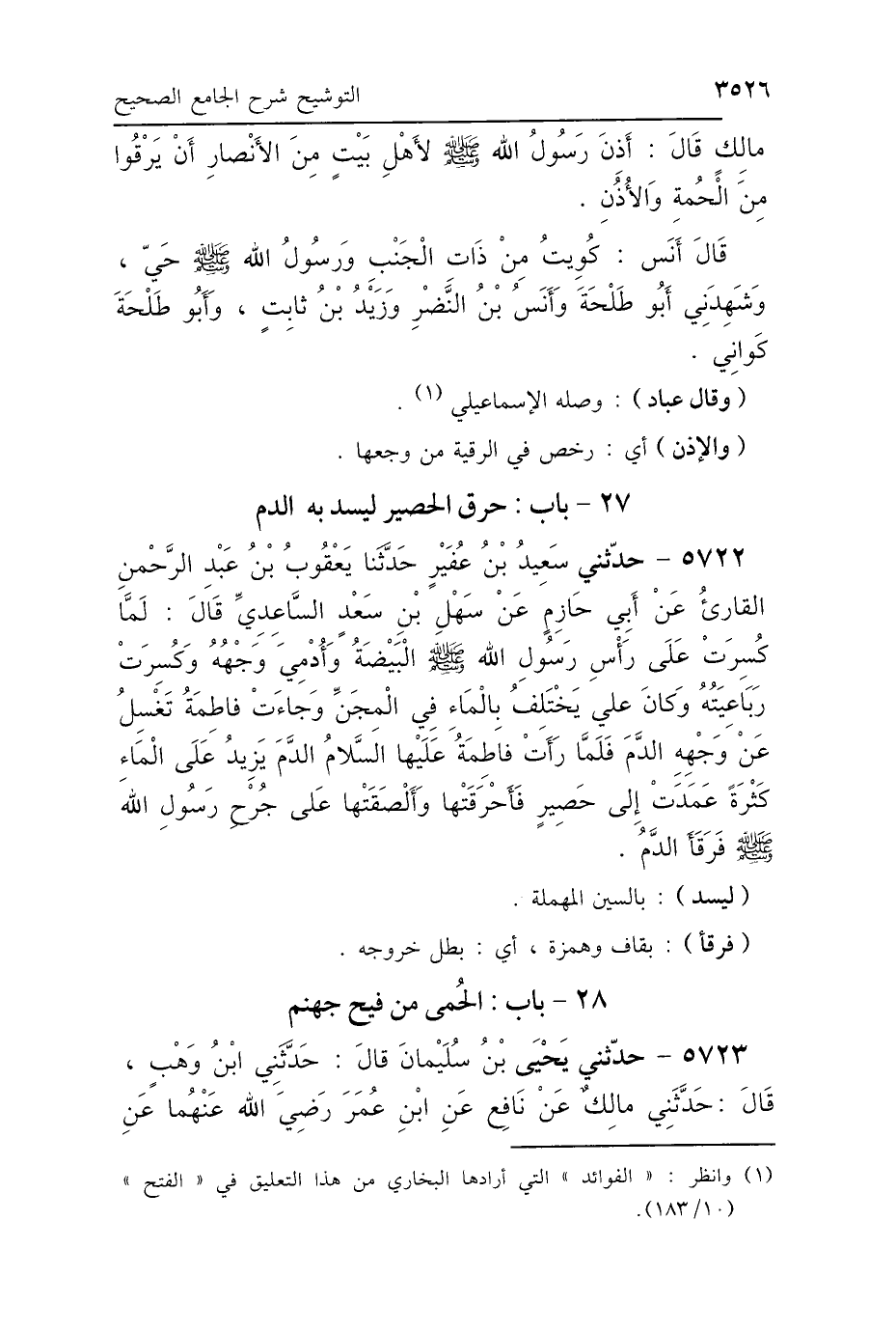 5722 - حَدَّثَنِي سَعِيدُ بْنُ عُفَيْرٍ، حَدَّثَنَا يَعْقُوبُ بْنُ عَبْدِ الرَّحْمَنِ القَارِيُّ، عَنْ أَبِي حَازِمٍ، عَنْ سَهْلِ بْنِ سَعْدٍ السَّاعِدِيِّ، قَالَ: «لَمَّا كُسِرَتْ عَلَى رَأْسِ رَسُولِ اللَّهِ صَلَّى اللهُ عَلَيْهِ وَسَلَّمَ البَيْضَةُ، وَأُدْمِيَ وَجْهُهُ، وَكُسِرَتْ رَبَاعِيَتُهُ، وَكَانَ عَلِيٌّ يَخْتَلِفُ بِالْمَاءِ فِي المِجَنِّ، وَجَاءَتْ فَاطِمَةُ تَغْسِلُ عَنْ وَجْهِهِ الدَّمَ، فَلَمَّا رَأَتْ فَاطِمَةُ عَلَيْهَا السَّلاَمُ الدَّمَ يَزِيدُ عَلَى المَاءِ كَثْرَةً، عَمَدَتِ الى حَصِيرٍ فَأَحْرَقَتْهَا، وَأَلْصَقَتْهَا عَلَى جُرْحِ رَسُولِ اللَّهِ صَلَّى اللهُ عَلَيْهِ وَسَلَّمَ، فَرَقَأَ الدَّمُ».