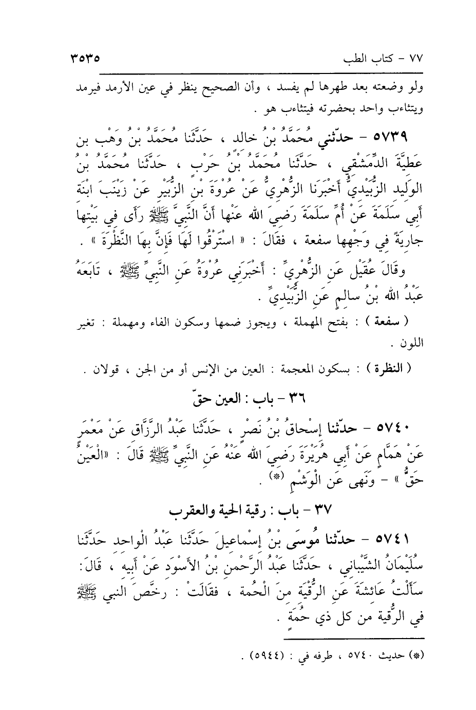 5739 - حَدَّثَنِي مُحَمَّدُ بْنُ خَالِدٍ، حَدَّثَنَا مُحَمَّدُ بْنُ وَهْبِ بْنِ عَطِيَّةَ الدِّمَشْقِيُّ، حَدَّثَنَا مُحَمَّدُ بْنُ حَرْبٍ، حَدَّثَنَا مُحَمَّدُ بْنُ الوَلِيدِ الزُّبَيْدِيُّ، أَخْبَرَنَا الزُّهْرِيُّ، عَنْ عُرْوَةَ بْنِ الزُّبَيْرِ، عَنْ زَيْنَبَ ابْنَةِ أَبِي سَلَمَةَ، عَنْ أُمِّ سَلَمَةَ، رَضِيَ اللَّهُ عَنْهَا: أَنَّ النَّبِيَّ صَلَّى اللهُ عَلَيْهِ وَسَلَّمَ رَأَى فِي بَيْتِهَا جَارِيَةً فِي وَجْهِهَا سَفْعَةٌ، فَقَالَ: «اسْتَرْقُوا لَهَا، فَإِنَّ بِهَا النَّظْرَةَ» تَابَعَهُ عَبْدُ اللَّهِ بْنُ سَالِمٍ، عَنِ الزُّبَيْدِيِّ وَقَالَ عُقَيْلٌ عَنِ الزُّهْرِيِّ، أَخْبَرَنِي عُرْوَةُ، عَنِ النَّبِيِّ صَلَّى اللهُ عَلَيْهِ وَسَلَّمَ.
