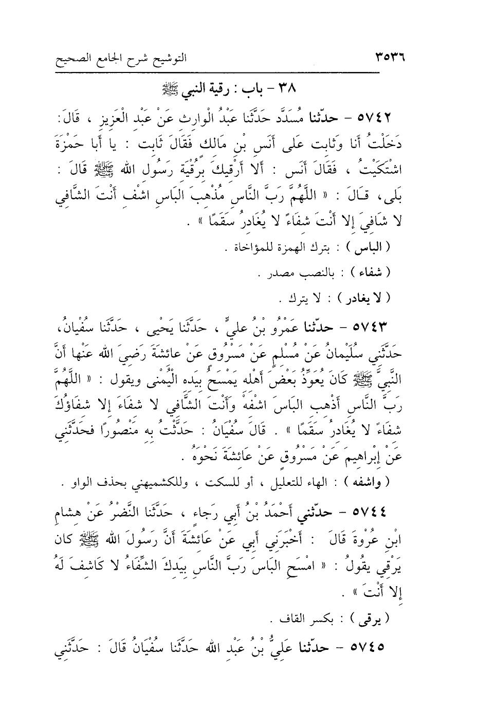 5743 - حَدَّثَنَا عَمْرُو بْنُ عَلِيٍّ، حَدَّثَنَا يَحْيَى، حَدَّثَنَا سُفْيَانُ، حَدَّثَنِي سُلَيْمَانُ، عَنْ مُسْلِمٍ، عَنْ مَسْرُوقٍ، عَنْ عَائِشَةَ، رَضِيَ اللَّهُ عَنْهَا: أَنَّ النَّبِيَّ صَلَّى اللهُ عَلَيْهِ وَسَلَّمَ كَانَ يُعَوِّذُ بَعْضَ أَهْلِهِ، يَمْسَحُ بِيَدِهِ اليُمْنَى وَيَقُولُ: «اللَّهُمَّ رَبَّ النَّاسِ أَذْهِبِ البَاسَ، اشْفِهِ وَأَنْتَ الشَّافِي، لاَ شِفَاءَ إِلَّا شِفَاؤُكَ، شِفَاءً لاَ يُغَادِرُ سَقَمًا» قَالَ سُفْيَانُ: حَدَّثْتُ بِهِ مَنْصُورًا، فَحَدَّثَنِي، عَنْ إِبْرَاهِيمَ، عَنْ مَسْرُوقٍ، عَنْ عَائِشَةَ، نَحْوَهُ.