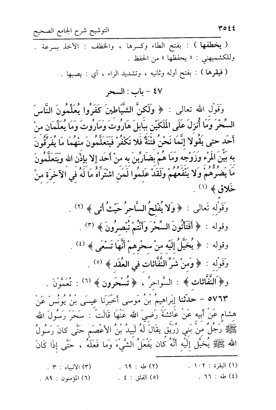 وَقَوْلِ اللَّهِ تَعَالَى: {وَلَكِنَّ الشَّيَاطِينَ كَفَرُوا يُعَلِّمُونَ النَّاسَ السِّحْرَ وَمَا أُنْزِلَ عَلَى المَلَكَيْنِ بِبَابِلَ هَارُوتَ وَمَارُوتَ وَمَا يُعَلِّمَانِ مِنْ أَحَدٍ حَتَّى يَقُولاَ إِنَّمَا نَحْنُ فِتْنَةٌ فَلاَ تَكْفُرْ فَيَتَعَلَّمُونَ مِنْهُمَا مَا يُفَرِّقُونَ بِهِ بَيْنَ المَرْءِ وَزَوْجِهِ، وَمَا هُمْ بِضَارِّينَ بِهِ مِنْ أَحَدٍ إِلَّا بِإِذْنِ اللَّهِ، وَيَتَعَلَّمُونَ مَا يَضُرُّهُمْ وَلاَ يَنْفَعُهُمْ، وَلَقَدْ عَلِمُوا لَمَنِ اشْتَرَاهُ مَا لَهُ فِي الآخِرَةِ مِنْ خَلاَقٍ} [البقرة: 102] وَقَوْلِهِ تَعَالَى: {وَلاَ يُفْلِحُ السَّاحِرُ حَيْثُ أَتَى} [طه: 69] وَقَوْلِهِ: {أَفَتَأْتُونَ السِّحْرَ وَأَنْتُمْ تُبْصِرُونَ} [الأنبياء: 3] وَقَوْلِهِ: {يُخَيَّلُ إِلَيْهِ مِنْ سِحْرِهِمْ أَنَّهَا تَسْعَى} [طه: 66] وَقَوْلِهِ: {وَمِنْ شَرِّ النَّفَّاثَاتِ فِي العُقَدِ} [الفلق: 4] وَالنَّفَّاثَاتُ: السَّوَاحِرُ، {تُسْحَرُونَ} [المؤمنون: 89]: تُعَمَّوْنَ.