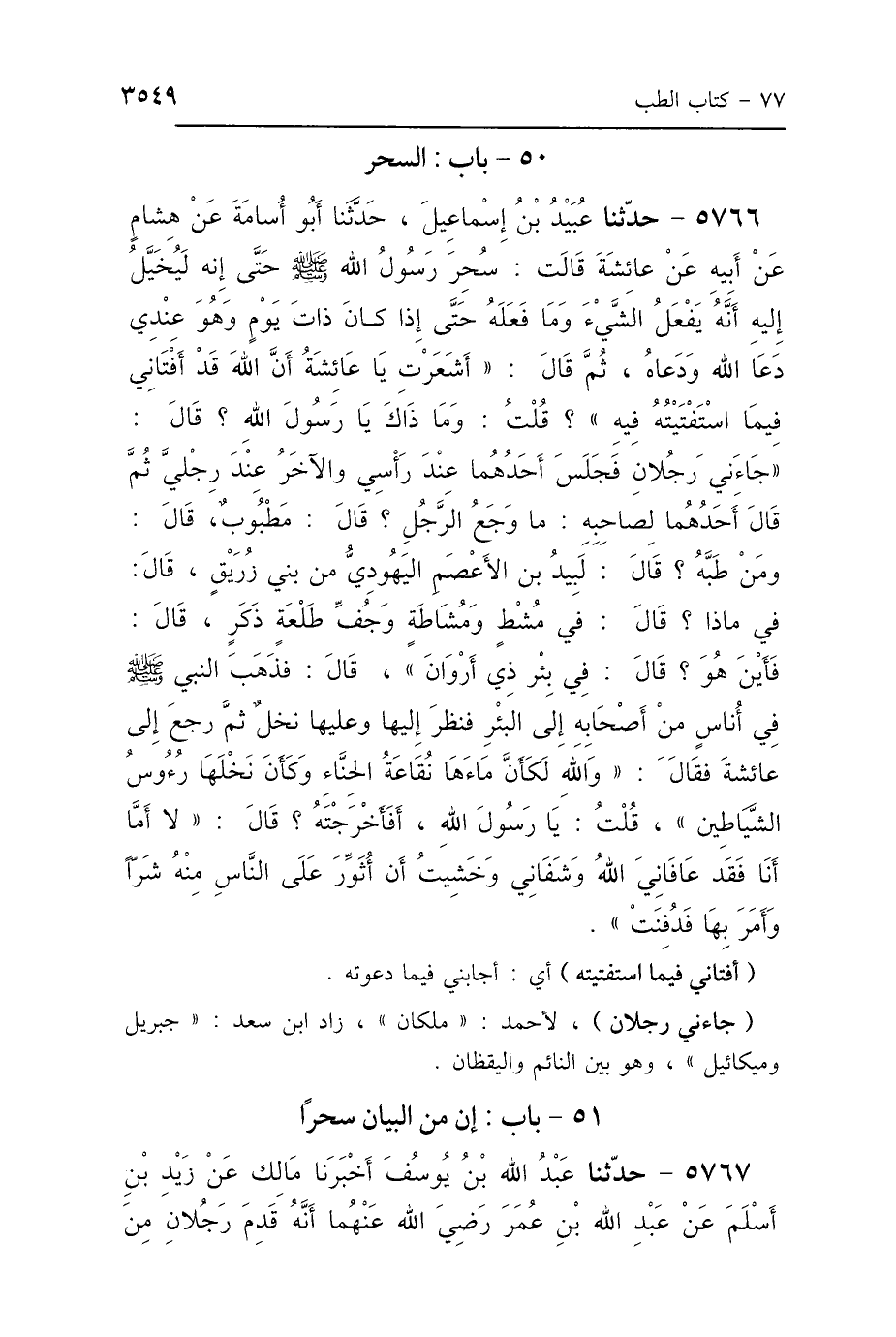 5766 - حَدَّثَنَا عُبَيْدُ بْنُ إِسْمَاعِيلَ، حَدَّثَنَا أَبُو أُسَامَةَ، عَنْ هِشَامٍ، عَنْ أَبِيهِ، عَنْ عَائِشَةَ، قَالَتْ: سُحِرَ النَّبِيُّ صَلَّى اللهُ عَلَيْهِ وَسَلَّمَ حَتَّى إِنَّهُ لَيُخَيَّلُ إِلَيْهِ أَنَّهُ يَفْعَلُ الشَّيْءَ وَمَا فَعَلَهُ، حَتَّى إِذَا كَانَ ذَاتَ يَوْمٍ وَهُوَ عِنْدِي، دَعَا اللَّهَ وَدَعَاهُ، ثُمَّ قَالَ: «أَشَعَرْتِ يَا عَائِشَةُ أَنَّ اللَّهَ قَدْ أَفْتَانِي فِيمَا اسْتَفْتَيْتُهُ فِيهِ» قُلْتُ: وَمَا ذَاكَ يَا رَسُولَ اللَّهِ؟ قَالَ: "جَاءَنِي رَجُلاَنِ، فَجَلَسَ أَحَدُهُمَا عِنْدَ رَأْسِي، وَالآخَرُ عِنْدَ رِجْلَيَّ، ثُمَّ قَالَ أَحَدُهُمَا لِصَاحِبِهِ: مَا وَجَعُ الرَّجُلِ؟ قَالَ: مَطْبُوبٌ، قَالَ: وَمَنْ طَبَّهُ؟ قَالَ: لَبِيدُ بْنُ الأَعْصَمِ اليَهُودِيُّ مِنْ بَنِي زُرَيْقٍ، قَالَ: فِيمَا ذَا؟ قَالَ: فِي مُشْطٍ وَمُشَاطَةٍ وَجُفِّ طَلْعَةٍ ذَكَرٍ، قَالَ: فَأَيْنَ هُوَ؟ قَالَ: فِي بِئْرِ ذِي أَرْوَانَ " قَالَ: فَذَهَبَ النَّبِيُّ صَلَّى اللهُ عَلَيْهِ وَسَلَّمَ فِي أُنَاسٍ مِنْ أَصْحَابِهِ إِلَى البِئْرِ، فَنَظَرَ إِلَيْهَا وَعَلَيْهَا نَخْلٌ، ثُمَّ رَجَعَ إِلَى عَائِشَةَ فَقَالَ: «وَاللَّهِ لَكَأَنَّ مَاءَهَا نُقَاعَةُ الحِنَّاءِ، وَلَكَأَنَّ نَخْلَهَا رُءُوسُ الشَّيَاطِينِ» قُلْتُ: يَا رَسُولَ اللَّهِ أَفَأَخْرَجْتَهُ؟ قَالَ: «لاَ، أَمَّا أَنَا فَقَدْ عَافَانِيَ اللَّهُ وَشَفَانِي، وَخَشِيتُ أَنْ أُثَوِّرَ عَلَى النَّاسِ مِنْهُ شَرًّا» وَأَمَرَ بِهَا فَدُفِنَتْ.