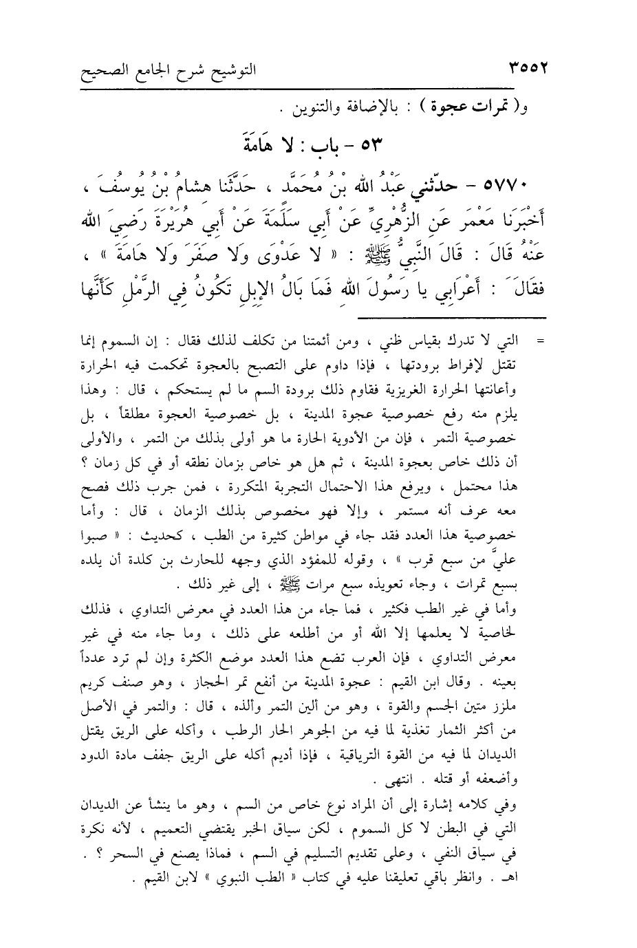 5770 - حَدَّثَنِي عَبْدُ اللَّهِ بْنُ مُحَمَّدٍ، حَدَّثَنَا هِشَامُ بْنُ يُوسُفَ، أَخْبَرَنَا مَعْمَرٌ، عَنِ الزُّهْرِيِّ، عَنْ أَبِي سَلَمَةَ، عَنْ أَبِي هُرَيْرَةَ رَضِيَ اللَّهُ عَنْهُ قَالَ: قَالَ النَّبِيُّ صَلَّى اللهُ عَلَيْهِ وَسَلَّمَ: «لاَ عَدْوَى وَلاَ صَفَرَ، وَلاَ هَامَةَ» فَقَالَ أَعْرَابِيٌّ: يَا رَسُولَ اللَّهِ، فَمَا بَالُ الإِبِلِ، تَكُونُ فِي الرَّمْلِ كَأَنَّهَا