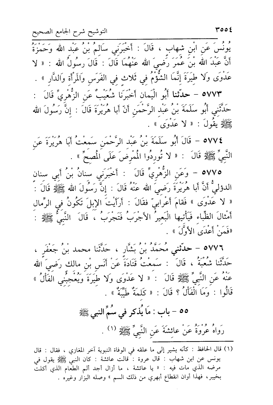 5774 - قَالَ أَبُو سَلَمَةَ بْنُ عَبْدِ الرَّحْمَنِ: سَمِعْتُ أَبَا هُرَيْرَةَ، عَنِ النَّبِيِّ صَلَّى اللهُ عَلَيْهِ وَسَلَّمَ قَالَ: «لاَ تُورِدُوا المُمْرِضَ عَلَى المُصِحِّ».