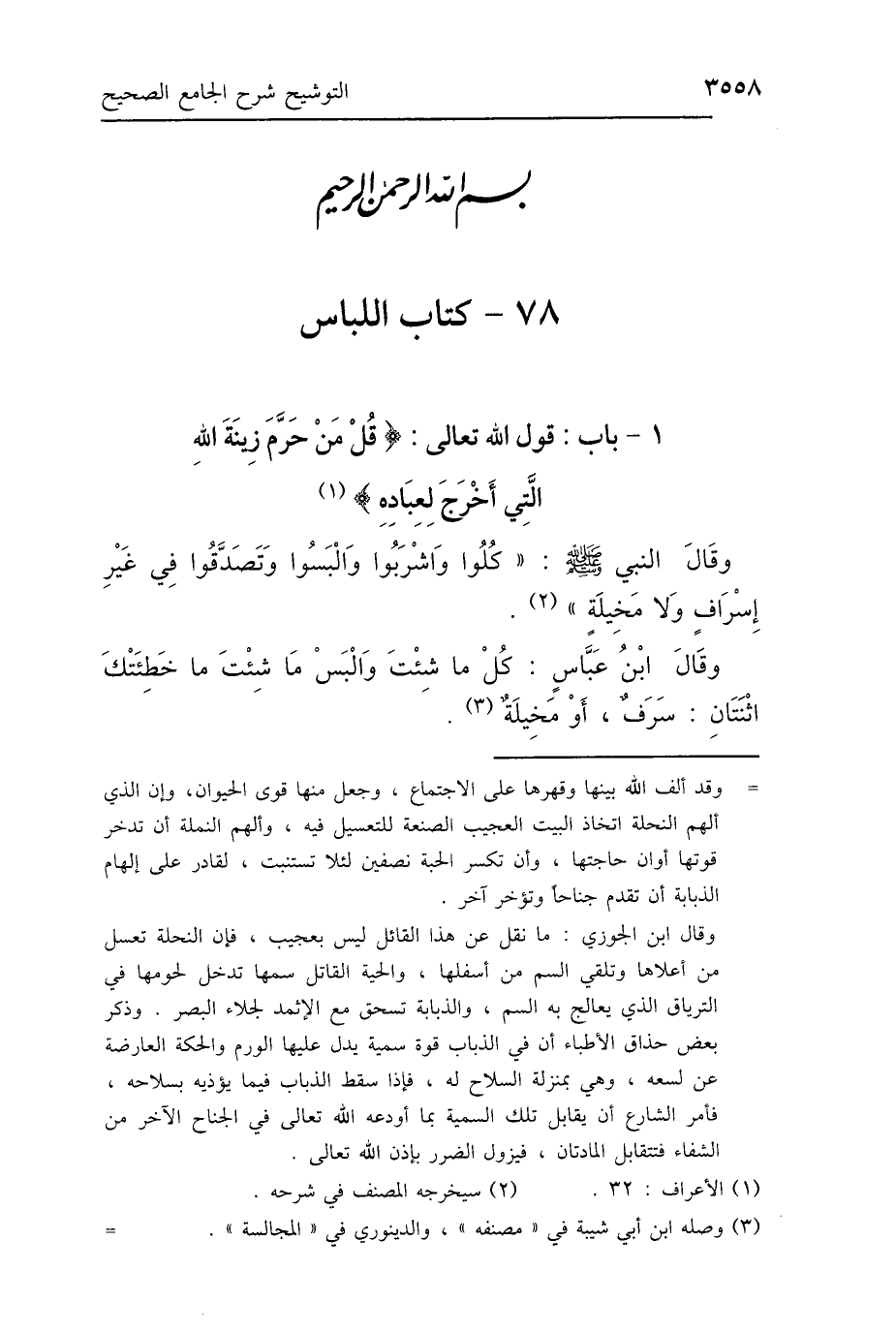 1 - بَابُ قَوْلِ اللَّهِ تَعَالَى: {قُلْ مَنْ حَرَّمَ زِينَةَ اللَّهِ الَّتِي أَخْرَجَ لِعِبَادِهِ} [الأعراف: 32]