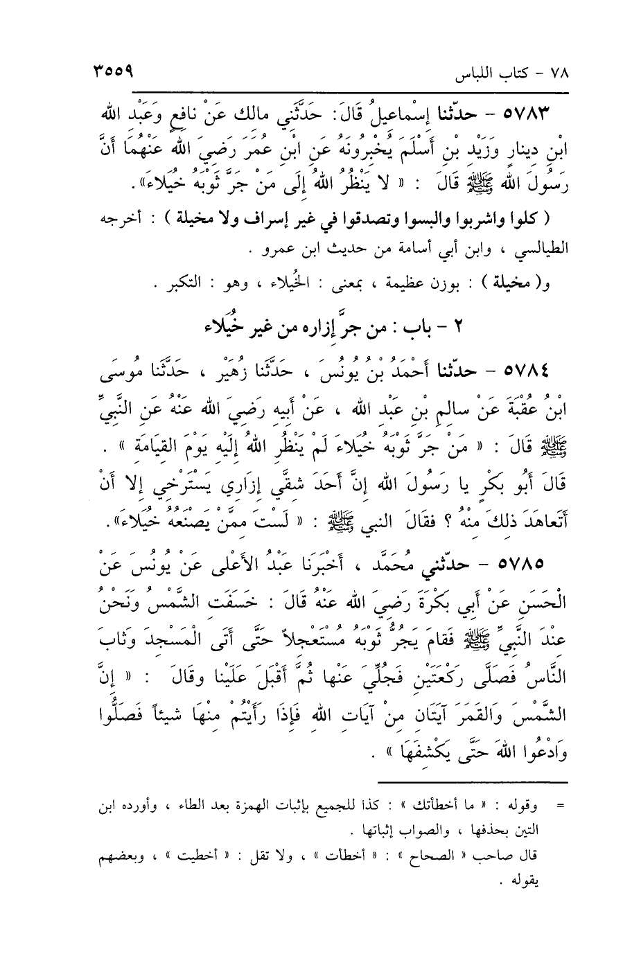 5784 - حَدَّثَنَا أَحْمَدُ بْنُ يُونُسَ، حَدَّثَنَا زُهَيْرٌ، حَدَّثَنَا مُوسَى بْنُ عُقْبَةَ، عَنْ سَالِمِ بْنِ عَبْدِ اللَّهِ، عَنْ أَبِيهِ رَضِيَ اللَّهُ عَنْهُ عَنِ النَّبِيِّ صَلَّى اللهُ عَلَيْهِ وَسَلَّمَ قَالَ: «مَنْ جَرَّ ثَوْبَهُ خُيَلاَءَ لَمْ يَنْظُرِ اللَّهُ إِلَيْهِ يَوْمَ القِيَامَةِ» قَالَ أَبُو بَكْرٍ: يَا رَسُولَ اللَّهِ، إِنَّ أَحَدَ شِقَّيْ إِزَارِي يَسْتَرْخِي، إِلَّا أَنْ أَتَعَاهَدَ ذَلِكَ مِنْهُ؟ فَقَالَ النَّبِيُّ صَلَّى اللهُ عَلَيْهِ وَسَلَّمَ: «لَسْتَ مِمَّنْ يَصْنَعُهُ خُيَلاَءَ».