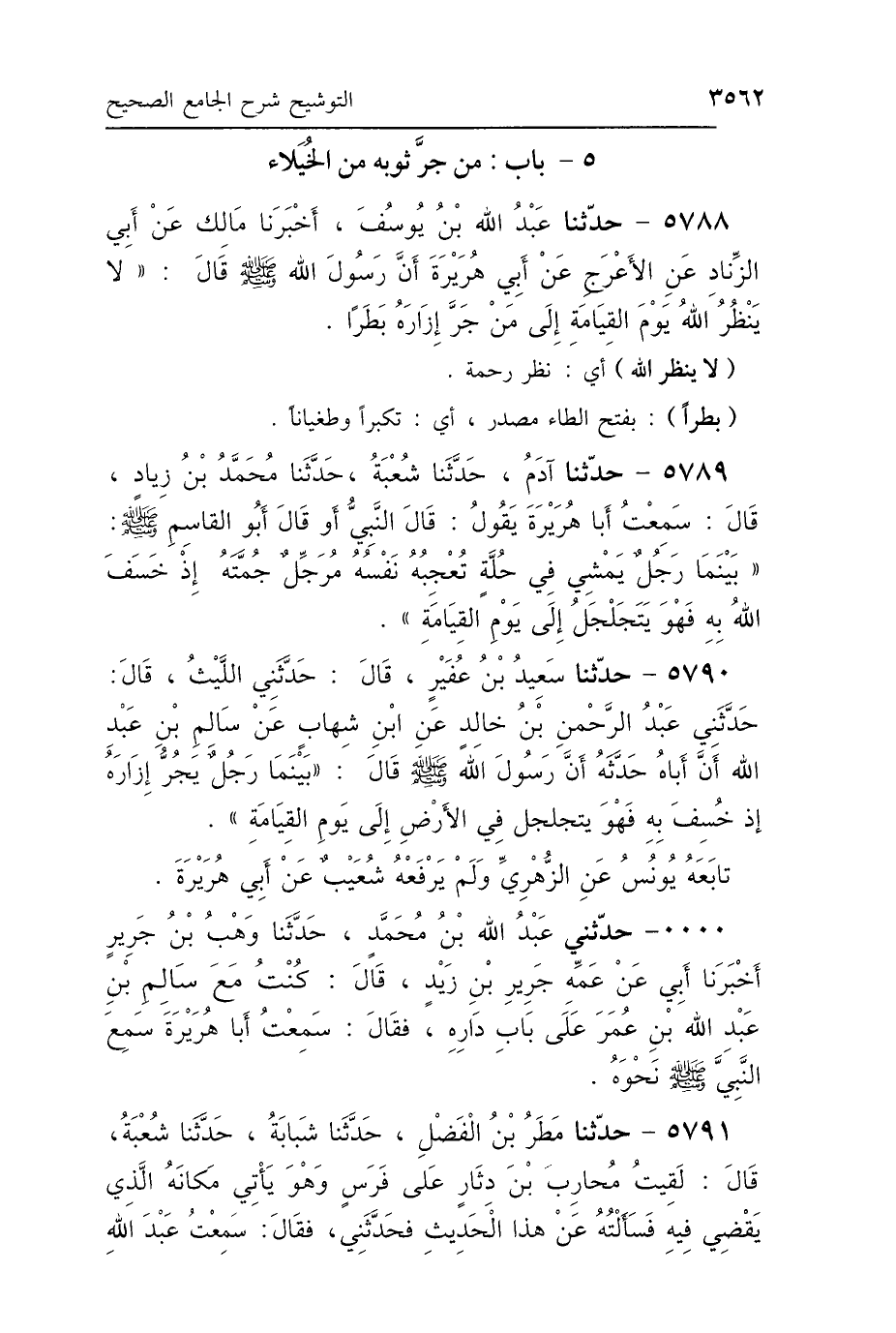 5788 - حَدَّثَنَا عَبْدُ اللَّهِ بْنُ يُوسُفَ، أَخْبَرَنَا مَالِكٌ، عَنْ أَبِي الزِّنَادِ، عَنِ الأَعْرَجِ، عَنْ أَبِي هُرَيْرَةَ، أَنَّ رَسُولَ اللَّهِ صَلَّى اللهُ عَلَيْهِ وَسَلَّمَ قَالَ: «لاَ يَنْظُرُ اللَّهُ يَوْمَ القِيَامَةِ إِلَى مَنْ جَرَّ إِزَارَهُ بَطَرًا».