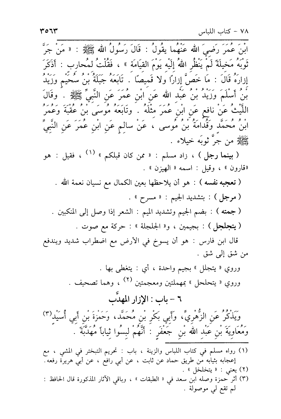 بْنَ عُمَرَ رَضِيَ اللَّهُ عَنْهُمَا يَقُولُ: قَالَ رَسُولُ اللَّهِ صَلَّى اللهُ عَلَيْهِ وَسَلَّمَ: «مَنْ جَرَّ ثَوْبَهُ مَخِيلَةً لَمْ يَنْظُرِ اللَّهُ إِلَيْهِ يَوْمَ القِيَامَةِ» فَقُلْتُ لِمُحَارِبٍ: أَذَكَرَ إِزَارَهُ؟ قَالَ: مَا خَصَّ إِزَارًا وَلاَ قَمِيصًا تَابَعَهُ جَبَلَةُ بْنُ سُحَيْمٍ، وَزَيْدُ بْنُ أَسْلَمَ، وَزَيْدُ بْنُ عَبْدِ اللَّهِ، عَنْ ابْنِ عُمَرَ، عَنِ النَّبِيِّ صَلَّى اللهُ عَلَيْهِ وَسَلَّمَ وَقَالَ: اللَّيْثُ، عَنْ نَافِعٍ، عَنْ ابْنِ عُمَرَ، مِثْلَهُ. وَتَابَعَهُ مُوسَى بْنُ عُقْبَةَ، وَعُمَرُ بْنُ مُحَمَّدٍ، وَقُدَامَةُ بْنُ مُوسَى، عَنْ سَالِمٍ، عَنْ ابْنِ عُمَرَ، عَنِ النَّبِيِّ صَلَّى اللهُ عَلَيْهِ وَسَلَّمَ: «مَنْ جَرَّ ثَوْبَهُ».