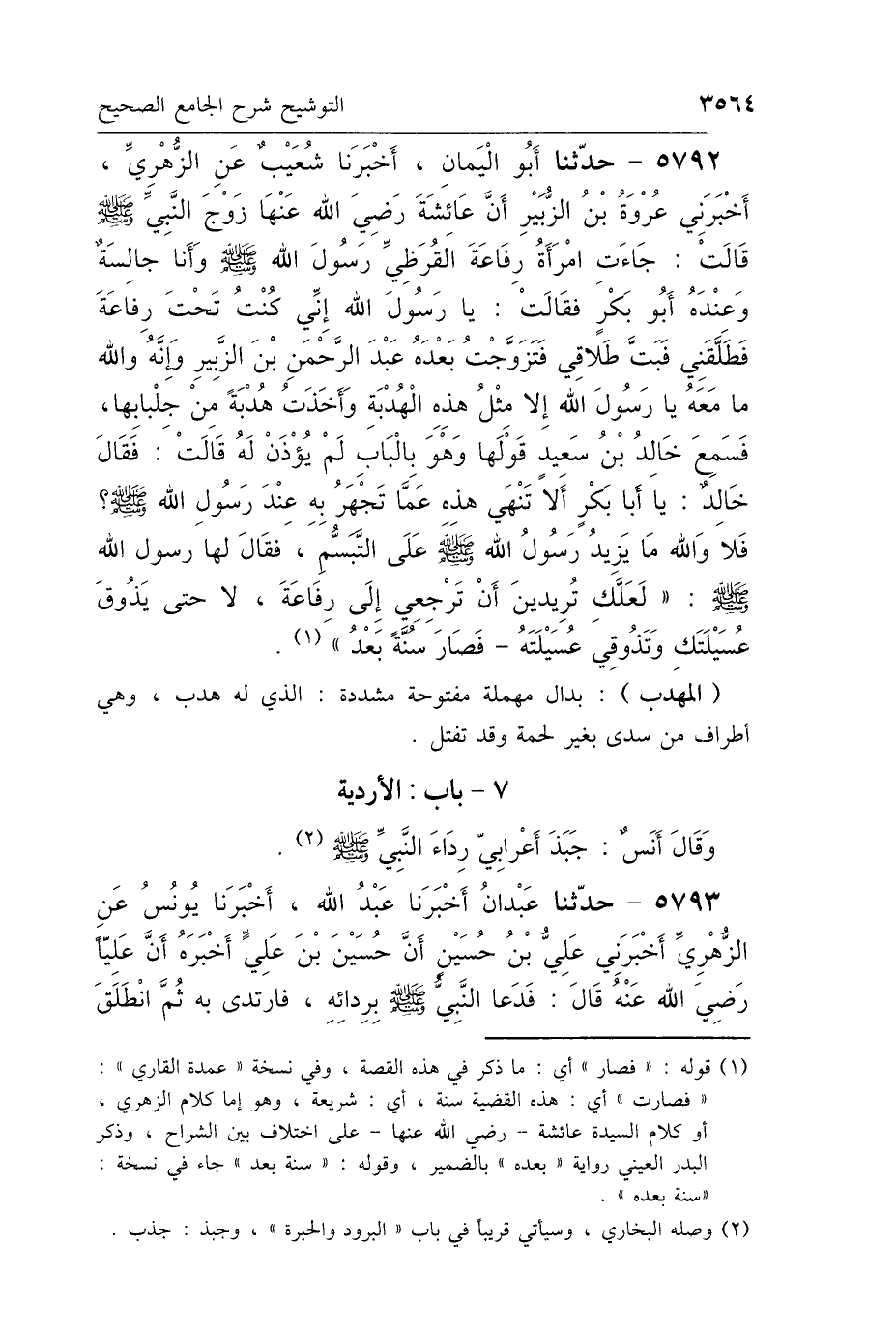 5792 - حَدَّثَنَا أَبُو اليَمَانِ، أَخْبَرَنَا شُعَيْبٌ، عَنِ الزُّهْرِيِّ، أَخْبَرَنِي عُرْوَةُ بْنُ الزُّبَيْرِ، أَنَّ عَائِشَةَ، رَضِيَ اللَّهُ عَنْهَا زَوْجَ النَّبِيِّ صَلَّى اللهُ عَلَيْهِ وَسَلَّمَ قَالَتْ: جَاءَتْ امْرَأَةُ رِفَاعَةَ القُرَظِيِّ رَسُولَ اللَّهِ صَلَّى اللهُ عَلَيْهِ وَسَلَّمَ وَأَنَا جَالِسَةٌ، وَعِنْدَهُ أَبُو بَكْرٍ، فَقَالَتْ: يَا رَسُولَ اللَّهِ، إِنِّي كُنْتُ تَحْتَ رِفَاعَةَ فَطَلَّقَنِي فَبَتَّ طَلاَقِي، فَتَزَوَّجْتُ بَعْدَهُ عَبْدَ الرَّحْمَنِ بْنَ الزَّبِيرِ، وَإِنَّهُ وَاللَّهِ مَا مَعَهُ يَا رَسُولَ اللَّهِ إِلَّا مِثْلُ هَذِهِ الهُدْبَةِ، وَأَخَذَتْ هُدْبَةً مِنْ جِلْبَابِهَا، فَسَمِعَ خَالِدُ بْنُ سَعِيدٍ قَوْلَهَا وَهُوَ بِالْبَابِ لَمْ يُؤْذَنْ لَهُ، قَالَتْ: فَقَالَ خَالِدٌ: يَا أَبَا بَكْرٍ، أَلاَ تَنْهَى هَذِهِ عَمَّا تَجْهَرُ بِهِ عِنْدَ رَسُولِ اللَّهِ صَلَّى اللهُ عَلَيْهِ وَسَلَّمَ؟ فَلاَ وَاللَّهِ مَا يَزِيدُ رَسُولُ اللَّهِ صَلَّى اللهُ عَلَيْهِ وَسَلَّمَ عَلَى التَّبَسُّمِ، فَقَالَ لَهَا رَسُولُ اللَّهِ صَلَّى اللهُ عَلَيْهِ وَسَلَّمَ: «لَعَلَّكِ تُرِيدِينَ أَنْ تَرْجِعِي إِلَى رِفَاعَةَ، لاَ، حَتَّى يَذُوقَ عُسَيْلَتَكِ وَتَذُوقِي عُسَيْلَتَهُ» فَصَارَ سُنَّةً بَعْدُ.