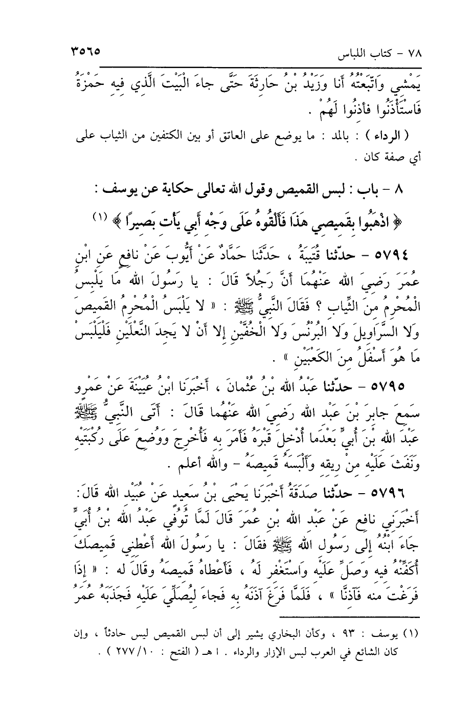 8 - بَابُ لُبْسِ القَمِيصِ وَقَوْلِ اللَّهِ تَعَالَى حِكَايَةً عَنْ يُوسُفَ: {اذْهَبُوا بِقَمِيصِي هَذَا فَأَلْقُوهُ عَلَى وَجْهِ أَبِي يَأْتِ بَصِيرًا} [يوسف: 93]