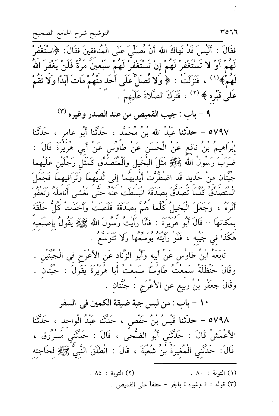 5797 - حَدَّثَنَا عَبْدُ اللَّهِ بْنُ مُحَمَّدٍ، حَدَّثَنَا أَبُو عَامِرٍ، حَدَّثَنَا إِبْرَاهِيمُ بْنُ نَافِعٍ، عَنْ الحَسَنِ، عَنْ طَاوُسٍ، عَنْ أَبِي هُرَيْرَةَ، قَالَ: ضَرَبَ رَسُولُ اللَّهِ صَلَّى اللهُ عَلَيْهِ وَسَلَّمَ: «مَثَلَ البَخِيلِ وَالمُتَصَدِّقِ، كَمَثَلِ رَجُلَيْنِ عَلَيْهِمَا جُبَّتَانِ مِنْ حَدِيدٍ، قَدِ اضْطُرَّتْ أَيْدِيهِمَا إِلَى ثُدِيِّهِمَا وَتَرَاقِيهِمَا، فَجَعَلَ المُتَصَدِّقُ كُلَّمَا تَصَدَّقَ بِصَدَقَةٍ انْبَسَطَتْ عَنْهُ، حَتَّى تَغْشَى أَنَامِلَهُ وَتَعْفُوَ أَثَرَهُ، وَجَعَلَ البَخِيلُ كُلَّمَا هَمَّ بِصَدَقَةٍ قَلَصَتْ، وَأَخَذَتْ كُلُّ حَلْقَةٍ بِمَكَانِهَا» قَالَ أَبُو هُرَيْرَةَ: فَأَنَا رَأَيْتُ رَسُولَ اللَّهِ صَلَّى اللهُ عَلَيْهِ وَسَلَّمَ يَقُولُ بِإِصْبَعِهِ «هَكَذَا فِي جَيْبِهِ، فَلَوْ رَأَيْتَهُ يُوَسِّعُهَا وَلاَ تَتَوَسَّعُ» تَابَعَهُ ابْنُ طَاوُسٍ، عَنْ أَبِيهِ، وَأَبُو الزِّنَادِ، عَنْ الأَعْرَجِ: «فِي الجُبَّتَيْنِ» وَقَالَ حَنْظَلَةُ: سَمِعْتُ طَاوُسًا: سَمِعْتُ أَبَا هُرَيْرَةَ، يَقُولُ: «جُبَّتَانِ» وَقَالَ جَعْفَرُ بْنُ حَيَّانَ، عَنْ الأَعْرَجِ: «جُبَّتَانِ».