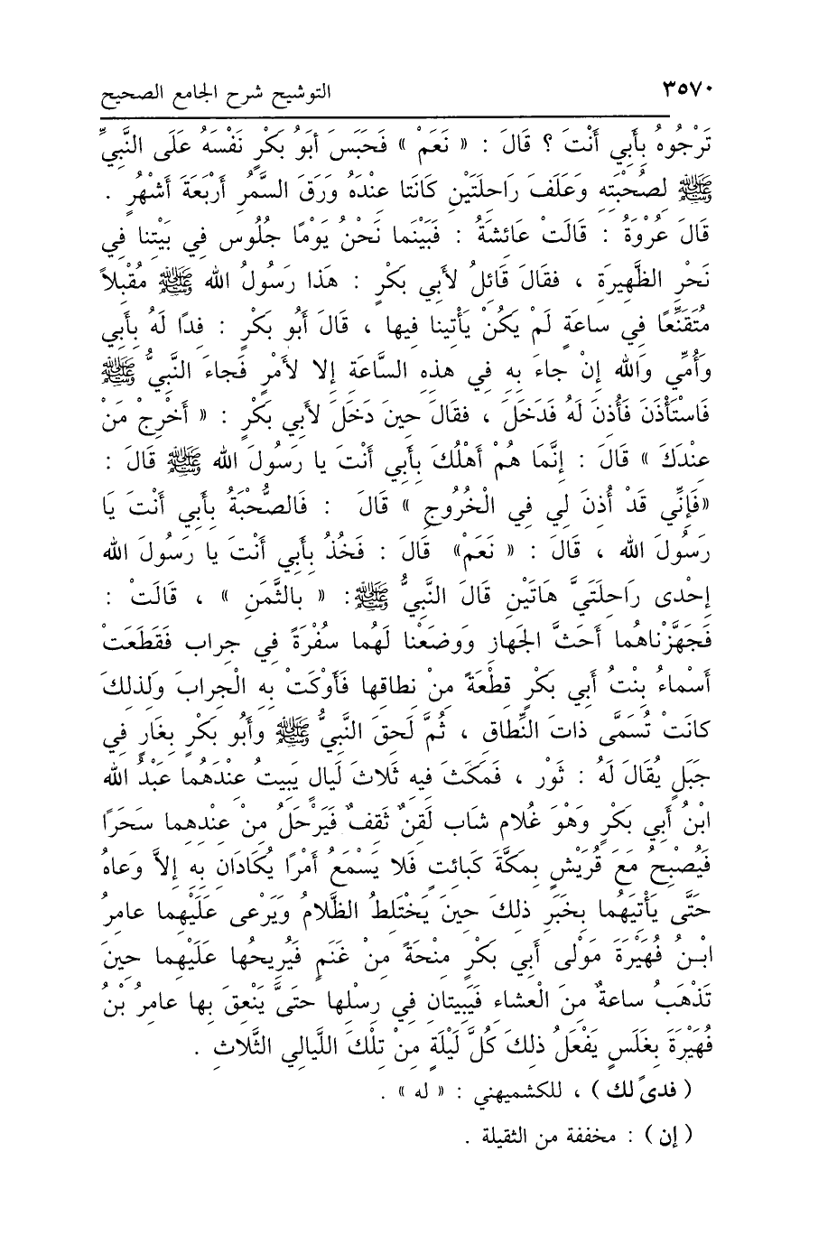 تَرْجُوهُ بِأَبِي أَنْتَ؟ قَالَ: «نَعَمْ» فَحَبَسَ أَبُو بَكْرٍ نَفْسَهُ عَلَى النَّبِيِّ صَلَّى اللهُ عَلَيْهِ وَسَلَّمَ لِصُحْبَتِهِ، وَعَلَفَ رَاحِلَتَيْنِ كَانَتَا عِنْدَهُ وَرَقَ السَّمُرِ أَرْبَعَةَ أَشْهُرٍ. قَالَ عُرْوَةُ: قَالَتْ عَائِشَةُ: فَبَيْنَا نَحْنُ يَوْمًا جُلُوسٌ فِي بَيْتِنَا فِي نَحْرِ الظَّهِيرَةِ، فَقَالَ قَائِلٌ لِأَبِي بَكْرٍ: هَذَا رَسُولُ اللَّهِ صَلَّى اللهُ عَلَيْهِ وَسَلَّمَ مُقْبِلًا مُتَقَنِّعًا، فِي سَاعَةٍ لَمْ يَكُنْ يَأْتِينَا فِيهَا، قَالَ أَبُو بَكْرٍ: فِدًا لَكَ أَبِي وَأُمِّي، وَاللَّهِ إِنْ جَاءَ بِهِ فِي هَذِهِ السَّاعَةِ إِلَّا لِأَمْرٍ، فَجَاءَ النَّبِيُّ صَلَّى اللهُ عَلَيْهِ وَسَلَّمَ فَاسْتَأْذَنَ فَأَذِنَ لَهُ فَدَخَلَ، فَقَالَ حِينَ دَخَلَ لِأَبِي بَكْرٍ: «أَخْرِجْ مَنْ عِنْدَكَ» قَالَ: إِنَّمَا هُمْ أَهْلُكَ بِأَبِي أَنْتَ يَا رَسُولَ اللَّهِ. قَالَ: «فَإِنِّي قَدْ أُذِنَ لِي فِي الخُرُوجِ» قَالَ: فَالصُّحْبَةُ بِأَبِي أَنْتَ وَأُمِّي يَا رَسُولَ اللَّهِ؟ قَالَ: «نَعَمْ» قَالَ: فَخُذْ بِأَبِي أَنْتَ يَا رَسُولَ اللَّهِ إِحْدَى رَاحِلَتَيَّ هَاتَيْنِ، قَالَ النَّبِيُّ صَلَّى اللهُ عَلَيْهِ وَسَلَّمَ: «بِالثَّمَنِ» قَالَتْ: فَجَهَّزْنَاهُمَا أَحَثَّ الجِهَازِ، وَضَعْنَا لَهُمَا سُفْرَةً فِي جِرَابٍ، فَقَطَعَتْ أَسْمَاءُ بِنْتُ أَبِي بَكْرٍ قِطْعَةً مِنْ نِطَاقِهَا، فَأَوْكَأَتْ بِهِ الجِرَابَ، وَلِذَلِكَ كَانَتْ تُسَمَّى ذَاتَ النِّطَاقِ. ثُمَّ لَحِقَ النَّبِيُّ صَلَّى اللهُ عَلَيْهِ وَسَلَّمَ وَأَبُو بَكْرٍ بِغَارٍ فِي جَبَلٍ يُقَالُ لَهُ ثَوْرٌ، فَمَكُثَ فِيهِ ثَلاَثَ لَيَالٍ، يَبِيتُ عِنْدَهُمَا عَبْدُ اللَّهِ بْنُ أَبِي بَكْرٍ، وَهُوَ غُلاَمٌ شَابٌّ لَقِنٌ ثَقِفٌ، فَيَرْحَلُ مِنْ عِنْدِهِمَا سَحَرًا، فَيُصْبِحُ مَعَ قُرَيْشٍ بِمَكَّةَ كَبَائِتٍ، فَلاَ يَسْمَعُ أَمْرًا يُكَادَانِ بِهِ إِلَّا وَعَاهُ، حَتَّى يَأْتِيَهُمَا بِخَبَرِ ذَلِكَ حِينَ يَخْتَلِطُ الظَّلاَمُ، وَيَرْعَى عَلَيْهِمَا عَامِرُ بْنُ فُهَيْرَةَ مَوْلَى أَبِي بَكْرٍ مِنْحَةً مِنْ غَنَمٍ، فَيُرِيحُهَا عَلَيْهِمَا حِينَ تَذْهَبُ سَاعَةٌ مِنَ العِشَاءِ، فَيَبِيتَانِ فِي رِسْلِهِمَا حَتَّى يَنْعِقَ بِهَا عَامِرُ بْنُ فُهَيْرَةَ بِغَلَسٍ، يَفْعَلُ ذَلِكَ كُلَّ لَيْلَةٍ مِنْ تِلْكَ اللَّيَالِي الثَّلاَثِ.