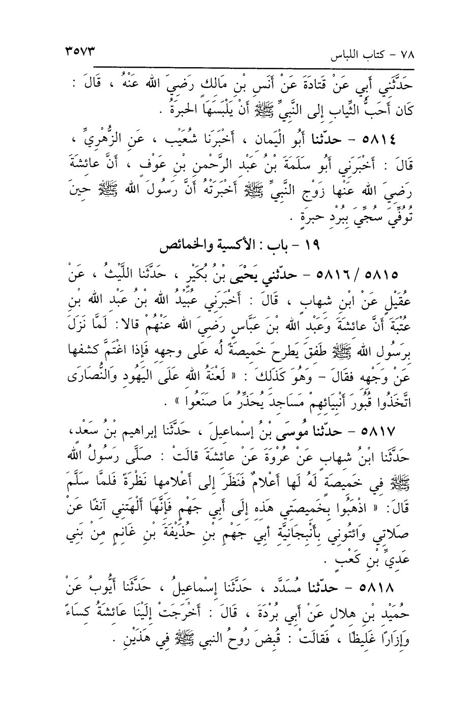 5814 - حَدَّثَنَا أَبُو اليَمَانِ، أَخْبَرَنَا شُعَيْبٌ، عَنِ الزُّهْرِيِّ، قَالَ: أَخْبَرَنِي أَبُو سَلَمَةَ بْنُ عَبْدِ الرَّحْمَنِ بْنِ عَوْفٍ، أَنَّ عَائِشَةَ، رَضِيَ اللَّهُ عَنْهَا زَوْجَ النَّبِيِّ صَلَّى اللهُ عَلَيْهِ وَسَلَّمَ أَخْبَرَتْهُ: «أَنَّ رَسُولَ اللَّهِ صَلَّى اللهُ عَلَيْهِ وَسَلَّمَ حِينَ تُوُفِّيَ سُجِّيَ بِبُرْدٍ حِبَرَةٍ».