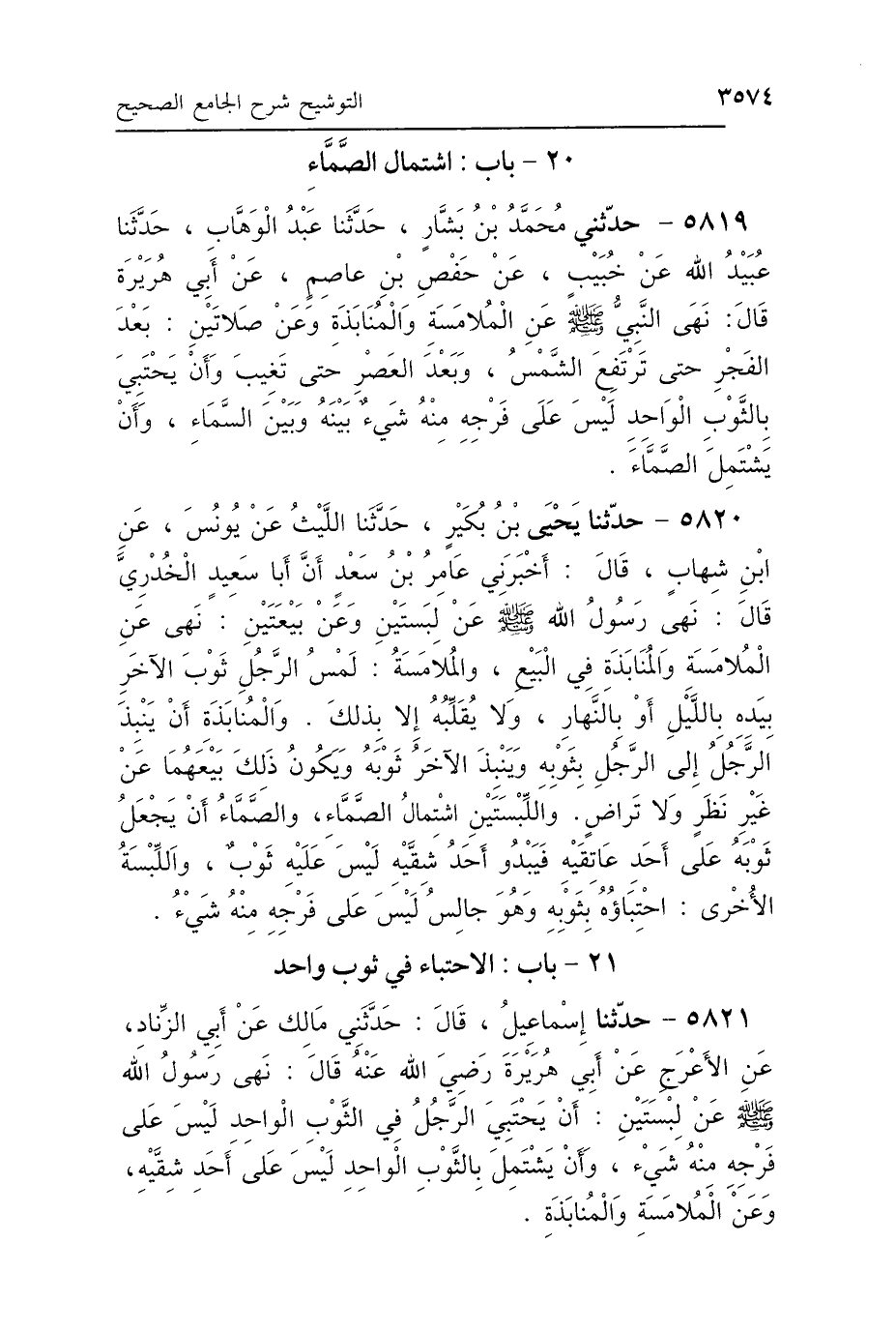 5819 - حَدَّثَنِي مُحَمَّدُ بْنُ بَشَّارٍ، حَدَّثَنَا عَبْدُ الوَهَّابِ، حَدَّثَنَا عُبَيْدُ اللَّهِ، عَنْ خُبَيْبٍ، عَنْ حَفْصِ بْنِ عَاصِمٍ، عَنْ أَبِي هُرَيْرَةَ رَضِيَ اللَّهُ عَنْهُ قَالَ: "نَهَى النَّبِيُّ صَلَّى اللهُ عَلَيْهِ وَسَلَّمَ عَنِ المُلاَمَسَةِ وَالمُنَابَذَةِ، وَعَنْ صَلاَتَيْنِ: بَعْدَ الفَجْرِ حَتَّى تَرْتَفِعَ الشَّمْسُ، وَبَعْدَ العَصْرِ حَتَّى تَغِيبَ، وَأَنْ يَحْتَبِيَ بِالثَّوْبِ الوَاحِدِ لَيْسَ عَلَى فَرْجِهِ مِنْهُ شَيْءٌ بَيْنَهُ وَبَيْنَ السَّمَاءِ، وَأَنْ يَشْتَمِلَ الصَّمَّاءَ".