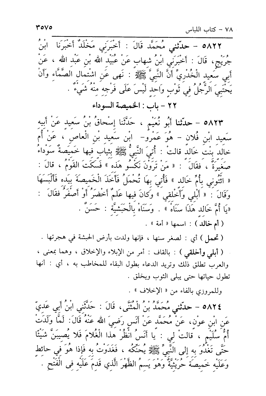 5823 - حَدَّثَنَا أَبُو نُعَيْمٍ، حَدَّثَنَا إِسْحَاقُ بْنُ سَعِيدٍ، عَنْ أَبِيهِ سَعِيدِ بْنِ فُلاَنٍ هُوَ عَمْرُو بْنُ سَعِيدِ بْنِ العَاصِ، عَنْ أُمِّ خَالِدٍ بِنْتِ خَالِدٍ: أُتِيَ النَّبِيُّ صَلَّى اللهُ عَلَيْهِ وَسَلَّمَ بِثِيَابٍ فِيهَا خَمِيصَةٌ سَوْدَاءُ صَغِيرَةٌ، فَقَالَ: «مَنْ تَرَوْنَ أَنْ نَكْسُوَ هَذِهِ» فَسَكَتَ القَوْمُ، قَالَ: «ائْتُونِي بِأُمِّ خَالِدٍ» فَأُتِيَ بِهَا تُحْمَلُ، فَأَخَذَ الخَمِيصَةَ بِيَدِهِ فَأَلْبَسَهَا، وَقَالَ: «أَبْلِي وَأَخْلِقِي» وَكَانَ فِيهَا عَلَمٌ أَخْضَرُ أَوْ أَصْفَرُ، فَقَالَ: «يَا أُمَّ خَالِدٍ، هَذَا سَنَاهْ» وَسَنَاهْ بِالحَبَشِيَّةِ حَسَنٌ.