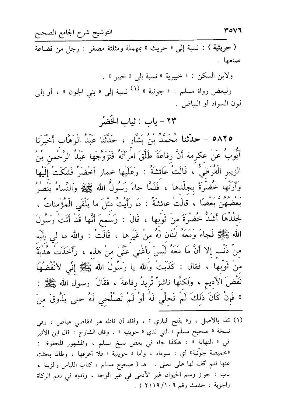 5825 - حَدَّثَنَا مُحَمَّدُ بْنُ بَشَّارٍ، حَدَّثَنَا عَبْدُ الوَهَّابِ، أَخْبَرَنَا أَيُّوبُ، عَنْ عِكْرِمَةَ: أَنَّ رِفَاعَةَ طَلَّقَ امْرَأَتَهُ، فَتَزَوَّجَهَا عَبْدُ الرَّحْمَنِ بْنُ الزَّبِيرِ القُرَظِيُّ، قَالَتْ عَائِشَةُ: وَعَلَيْهَا خِمَارٌ أَخْضَرُ، فَشَكَتْ إِلَيْهَا وَأَرَتْهَا خُضْرَةً بِجِلْدِهَا، فَلَمَّا جَاءَ رَسُولُ اللَّهِ صَلَّى اللهُ عَلَيْهِ وَسَلَّمَ، وَالنِّسَاءُ يَنْصُرُ بَعْضُهُنَّ بَعْضًا، قَالَتْ عَائِشَةُ: مَا رَأَيْتُ مِثْلَ مَا يَلْقَى المُؤْمِنَاتُ؟ لَجِلْدُهَا أَشَدُّ خُضْرَةً مِنْ ثَوْبِهَا. قَالَ: وَسَمِعَ أَنَّهَا قَدْ أَتَتْ رَسُولَ اللَّهِ صَلَّى اللهُ عَلَيْهِ وَسَلَّمَ، فَجَاءَ وَمَعَهُ ابْنَانِ لَهُ مِنْ غَيْرِهَا، قَالَتْ: وَاللَّهِ مَا لِي إِلَيْهِ مِنْ ذَنْبٍ، إِلَّا أَنَّ مَا مَعَهُ لَيْسَ بِأَغْنَى عَنِّي مِنْ هَذِهِ، وَأَخَذَتْ هُدْبَةً مِنْ ثَوْبِهَا، فَقَالَ: كَذَبَتْ وَاللَّهِ يَا رَسُولَ اللَّهِ، إِنِّي لَأَنْفُضُهَا نَفْضَ الأَدِيمِ، وَلَكِنَّهَا نَاشِزٌ، تُرِيدُ رِفَاعَةَ، فَقَالَ رَسُولُ اللَّهِ صَلَّى اللهُ عَلَيْهِ وَسَلَّمَ: " فَإِنْ كَانَ ذَلِكِ لَمْ تَحِلِّي لَهُ، أَوْ: لَمْ تَصْلُحِي لَهُ حَتَّى يَذُوقَ مِنْ