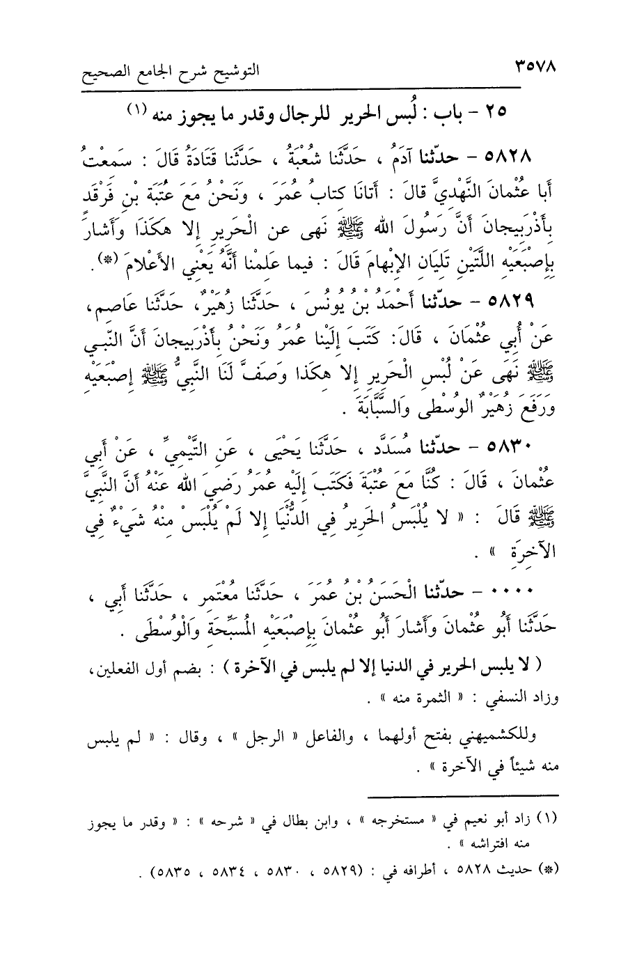 5828 - حَدَّثَنَا آدَمُ، حَدَّثَنَا شُعْبَةُ، حَدَّثَنَا قَتَادَةُ، قَالَ: سَمِعْتُ أَبَا عُثْمَانَ النَّهْدِيَّ: أَتَانَا كِتَابُ عُمَرَ، وَنَحْنُ مَعَ عُتْبَةَ بْنِ فَرْقَدٍ بِأَذْرَبِيجَانَ: أَنَّ رَسُولَ اللَّهِ صَلَّى اللهُ عَلَيْهِ وَسَلَّمَ " نَهَى عَنِ الحَرِيرِ إِلَّا هَكَذَا، وَأَشَارَ بِإِصْبَعَيْهِ اللَّتَيْنِ تَلِيَانِ الإِبْهَامَ، قَالَ: فِيمَا عَلِمْنَا أَنَّهُ يَعْنِي الأَعْلاَمَ.