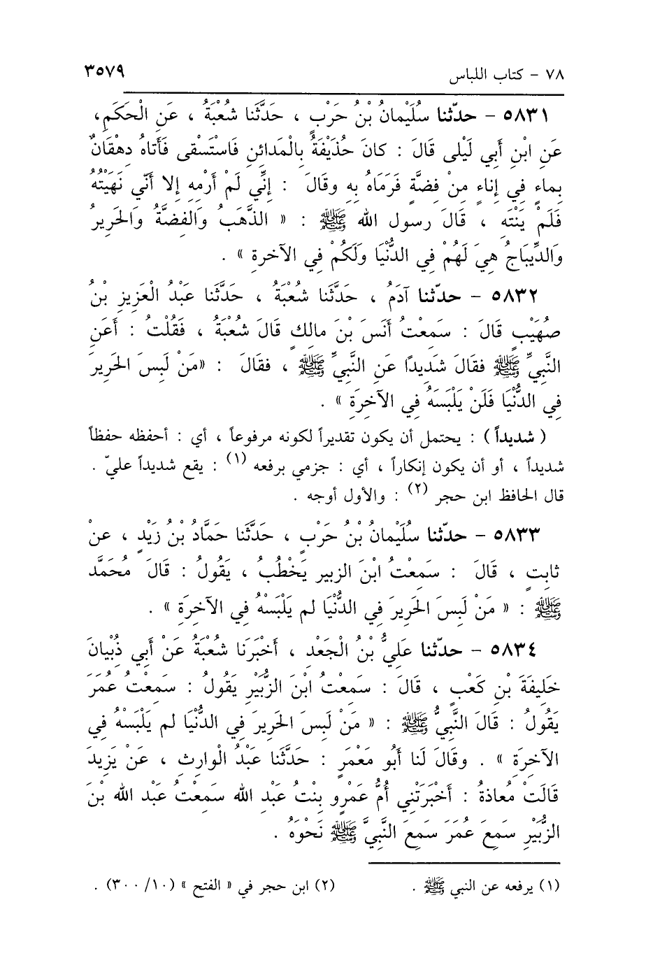 5833 - حَدَّثَنَا سُلَيْمَانُ بْنُ حَرْبٍ، حَدَّثَنَا حَمَّادُ بْنُ زَيْدٍ، عَنْ ثَابِتٍ، قَالَ: سَمِعْتُ ابْنَ الزُّبَيْرِ، يَخْطُبُ يَقُولُ: قَالَ مُحَمَّدٌ صَلَّى اللهُ عَلَيْهِ وَسَلَّمَ: «مَنْ لَبِسَ الحَرِيرَ فِي الدُّنْيَا لَمْ يَلْبَسْهُ فِي الآخِرَةِ».