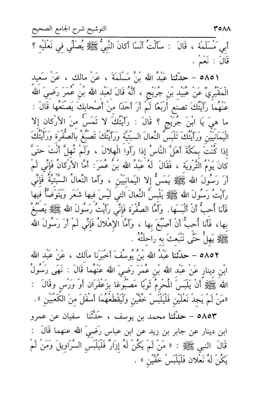 5851 - حَدَّثَنَا عَبْدُ اللَّهِ بْنُ مَسْلَمَةَ، عَنْ مَالِكٍ، عَنْ سَعِيدٍ المَقْبُرِيِّ، عَنْ عُبَيْدِ بْنِ جُرَيْجٍ: أَنَّهُ قَالَ لِعَبْدِ اللَّهِ بْنِ عُمَرَ، رَضِيَ اللَّهُ عَنْهُمَا: رَأَيْتُكَ تَصْنَعُ أَرْبَعًا لَمْ أَرَ أَحَدًا مِنْ أَصْحَابِكَ يَصْنَعُهَا، قَالَ: مَا هِيَ يَا ابْنَ جُرَيْجٍ؟ قَالَ: رَأَيْتُكَ لاَ تَمَسُّ مِنَ الأَرْكَانِ إِلَّا اليَمَانِيَيْنِ، وَرَأَيْتُكَ تَلْبَسُ النِّعَالَ السِّبْتِيَّةَ، وَرَأَيْتُكَ تَصْبُغُ بِالصُّفْرَةِ، وَرَأَيْتُكَ إِذَا كُنْتَ بِمَكَّةَ، أَهَلَّ النَّاسُ إِذَا رَأَوُا الْهِلاَلَ، وَلَمْ تُهِلَّ أَنْتَ حَتَّى كَانَ يَوْمُ التَّرْوِيَةِ. فَقَالَ لَهُ عَبْدُ اللَّهِ بْنُ عُمَرَ: أَمَّا الأَرْكَانُ: " فَإِنِّي لَمْ أَرَ رَسُولَ اللَّهِ صَلَّى اللهُ عَلَيْهِ وَسَلَّمَ يَمَسُّ إِلَّا اليَمَانِيَيْنِ، وَأَمَّا النِّعَالُ السِّبْتِيَّةُ: فَإِنِّي رَأَيْتُ رَسُولَ اللَّهِ صَلَّى اللهُ عَلَيْهِ وَسَلَّمَ يَلْبَسُ النِّعَالَ الَّتِي لَيْسَ فِيهَا شَعَرٌ وَيَتَوَضَّأُ فِيهَا، فَأَنَا أُحِبُّ أَنْ أَلْبَسَهَا، وَأَمَّا الصُّفْرَةُ: فَإِنِّي رَأَيْتُ رَسُولَ اللَّهِ صَلَّى اللهُ عَلَيْهِ وَسَلَّمَ يَصْبُغُ بِهَا، فَأَنَا أُحِبُّ أَنْ أَصْبُغَ بِهَا، وَأَمَّا الإِهْلاَلُ: فَإِنِّي لَمْ أَرَ رَسُولَ اللَّهِ صَلَّى اللهُ عَلَيْهِ وَسَلَّمَ يُهِلُّ حَتَّى تَنْبَعِثَ بِهِ رَاحِلَتُهُ".