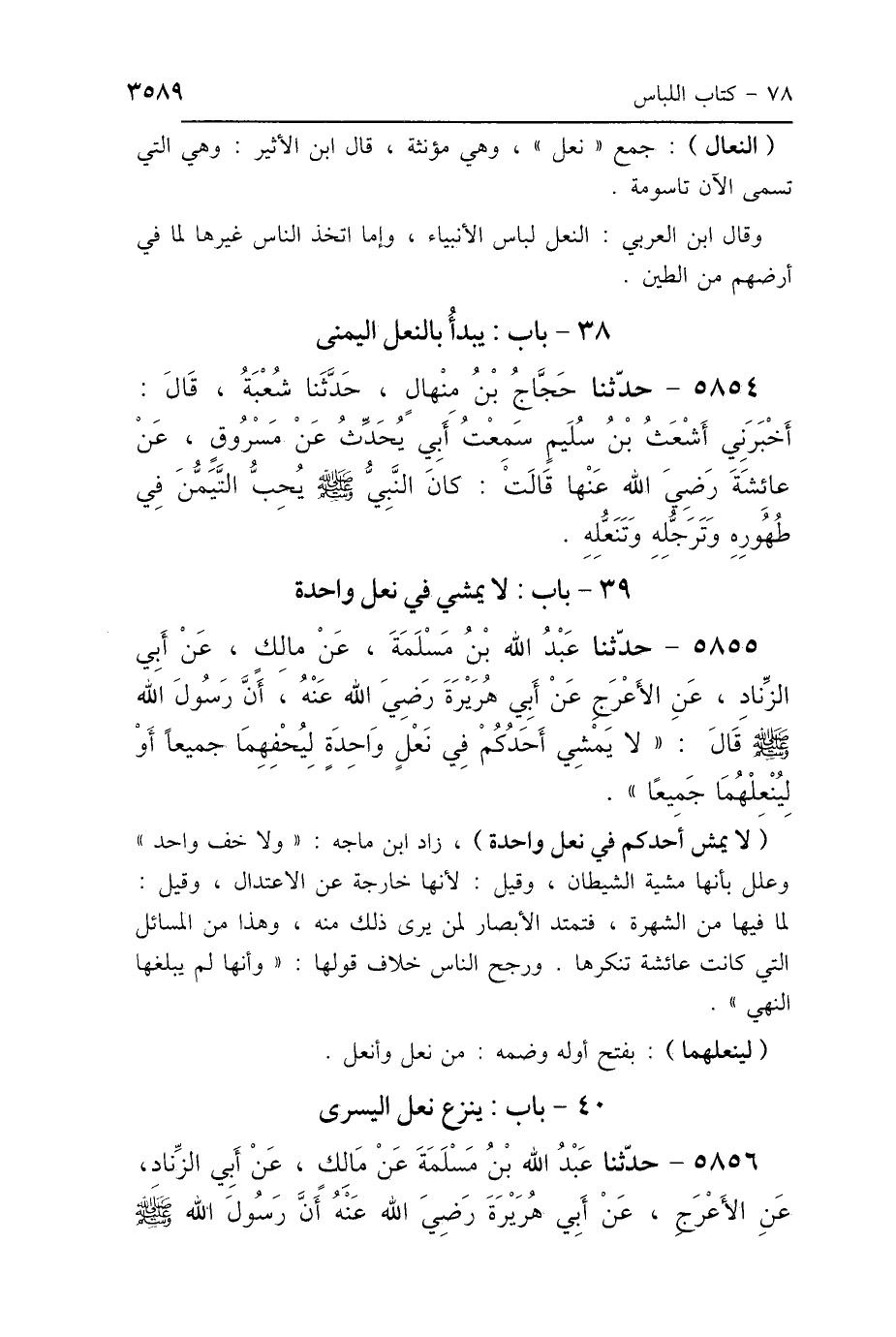 5854 - حَدَّثَنَا حَجَّاجُ بْنُ مِنْهَالٍ، حَدَّثَنَا شُعْبَةُ، قَالَ: أَخْبَرَنِي أَشْعَثُ بْنُ سُلَيْمٍ، سَمِعْتُ أَبِي، يُحَدِّثُ، عَنْ مَسْرُوقٍ، عَنْ عَائِشَةَ، رَضِيَ اللَّهُ عَنْهَا قَالَتْ: «كَانَ النَّبِيُّ صَلَّى اللهُ عَلَيْهِ وَسَلَّمَ يُحِبُّ التَّيَمُّنَ فِي طُهُورِهِ، وَتَرَجُّلِهِ، وَتَنَعُّلِهِ».