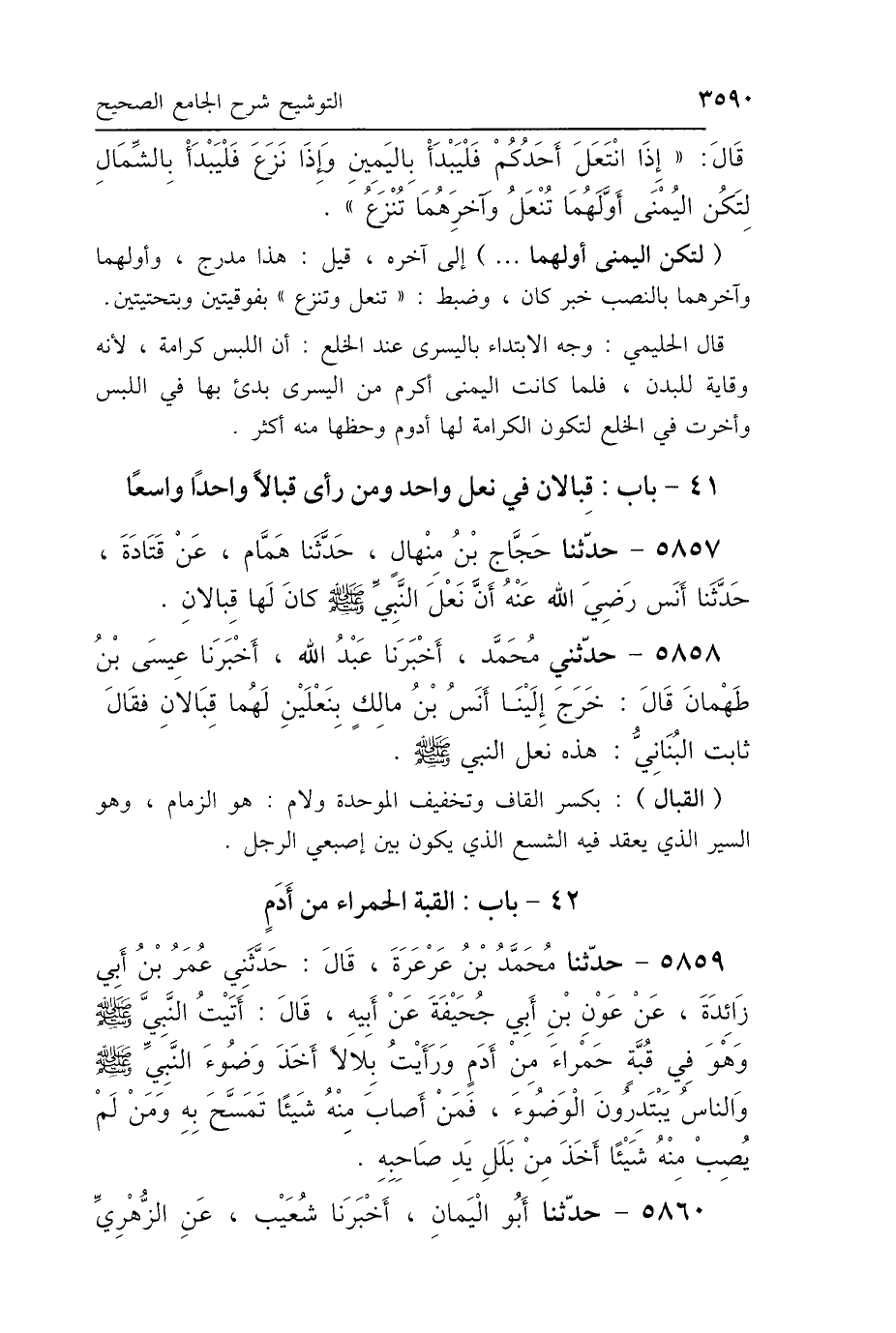 5857 - حَدَّثَنَا حَجَّاجُ بْنُ مِنْهَالٍ، حَدَّثَنَا هَمَّامٌ، عَنْ قَتَادَةَ، حَدَّثَنَا أَنَسٌ رَضِيَ اللَّهُ عَنْهُ: «أَنَّ نَعْلَ النَّبِيِّ صَلَّى اللهُ عَلَيْهِ وَسَلَّمَ كَانَ لَهَا قِبَالاَنِ».