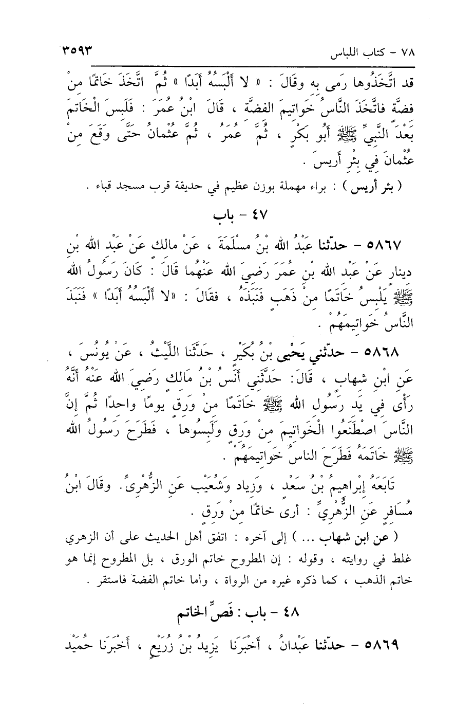 5868 - حَدَّثَنِي يَحْيَى بْنُ بُكَيْرٍ، حَدَّثَنَا اللَّيْثُ، عَنْ يُونُسَ، عَنِ ابْنِ شِهَابٍ، قَالَ: حَدَّثَنِي أَنَسُ بْنُ مَالِكٍ رَضِيَ اللَّهُ عَنْهُ «أَنَّهُ رَأَى فِي يَدِ رَسُولِ اللَّهِ صَلَّى اللهُ عَلَيْهِ وَسَلَّمَ خَاتَمًا مِنْ وَرِقٍ يَوْمًا وَاحِدًا، ثُمَّ إِنَّ النَّاسَ اصْطَنَعُوا الخَوَاتِيمَ مِنْ وَرِقٍ وَلَبِسُوهَا، فَطَرَحَ رَسُولُ اللَّهِ صَلَّى اللهُ عَلَيْهِ وَسَلَّمَ خَاتَمَهُ، فَطَرَحَ النَّاسُ خَوَاتِيمَهُمْ» تَابَعَهُ إِبْرَاهِيمُ بْنُ سَعْدٍ، وَزِيَادٌ، وَشُعَيْبٌ، عَنِ الزُّهْرِيِّ، وَقَالَ ابْنُ مُسَافِرٍ عَنِ الزُّهْرِيِّ: أَرَى: خَاتَمًا مِنْ وَرِقٍ.
