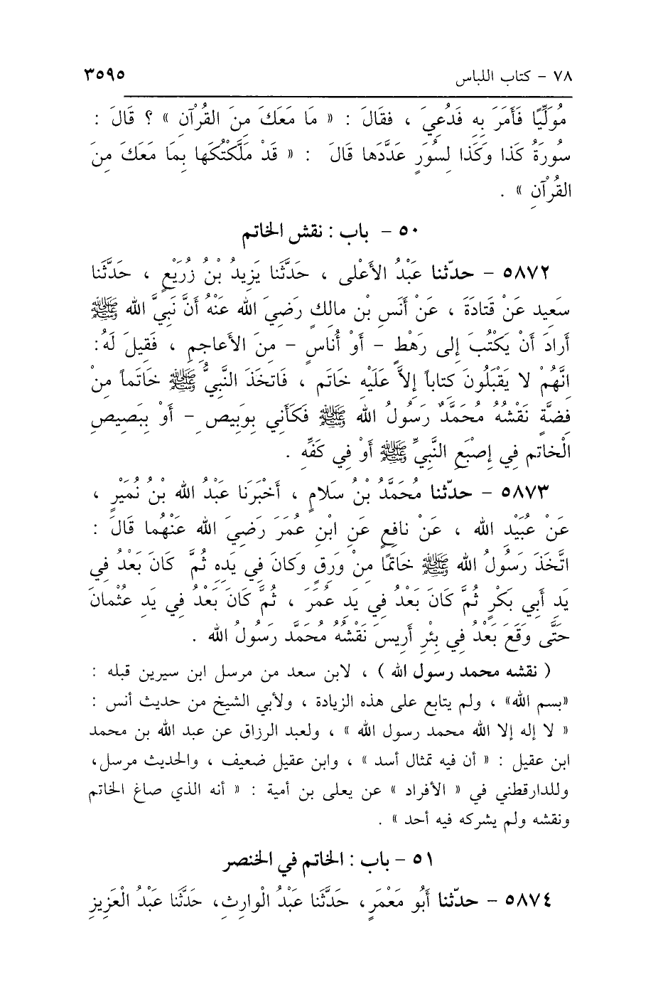 5873 - حَدَّثَنِي مُحَمَّدُ بْنُ سَلاَمٍ، أَخْبَرَنَا عَبْدُ اللَّهِ بْنُ نُمَيْرٍ، عَنْ عُبَيْدِ اللَّهِ، عَنْ نَافِعٍ، عَنِ ابْنِ عُمَرَ، رَضِيَ اللَّهُ عَنْهُمَا قَالَ: " اتَّخَذَ رَسُولُ اللَّهِ صَلَّى اللهُ عَلَيْهِ وَسَلَّمَ خَاتَمًا مِنْ وَرِقٍ، وَكَانَ فِي يَدِهِ، ثُمَّ كَانَ بَعْدُ فِي يَدِ أَبِي بَكْرٍ، ثُمَّ كَانَ بَعْدُ فِي يَدِ عُمَرَ، ثُمَّ كَانَ بَعْدُ فِي يَدِ عُثْمَانَ، حَتَّى وَقَعَ بَعْدُ فِي بِئْرِ أَرِيسَ، نَقْشُهُ: مُحَمَّدٌ رَسُولُ اللَّهِ.
