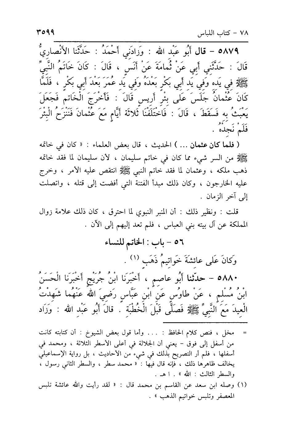 5879 - قَالَ أَبُو عَبْدِ اللَّهِ: وَزَادَنِي أَحْمَدُ: حَدَّثَنَا الأَنْصَارِيُّ، قَالَ: حَدَّثَنِي أَبِي، عَنْ ثُمَامَةَ، عَنْ أَنَسٍ، قَالَ: كَانَ خَاتَمُ النَّبِيِّ صَلَّى اللهُ عَلَيْهِ وَسَلَّمَ فِي يَدِهِ، وَفِي يَدِ أَبِي بَكْرٍ بَعْدَهُ، وَفِي يَدِ عُمَرَ بَعْدَ أَبِي بَكْرٍ فَلَمَّا كَانَ عُثْمَانُ، جَلَسَ عَلَى بِئْرِ أَرِيسَ قَالَ: فَأَخْرَجَ الخَاتَمَ فَجَعَلَ يَعْبَثُ بِهِ فَسَقَطَ، قَالَ: فَاخْتَلَفْنَا ثَلاَثَةَ أَيَّامٍ مَعَ عُثْمَانَ، فَنَزَحَ البِئْرَ فَلَمْ يَجِدْهُ.