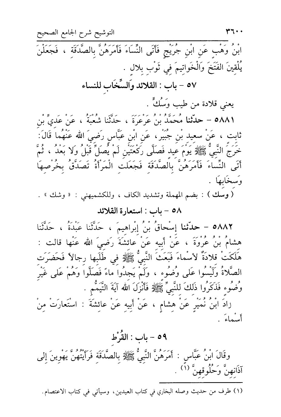 وَقَالَ ابْنُ عَبَّاسٍ: «أَمَرَهُنَّ النَّبِيُّ صَلَّى اللهُ عَلَيْهِ وَسَلَّمَ بِالصَّدَقَةِ، فَرَأَيْتُهُنَّ يَهْوِينَ إِلَى آذَانِهِنَّ وَحُلُوقِهِنَّ».